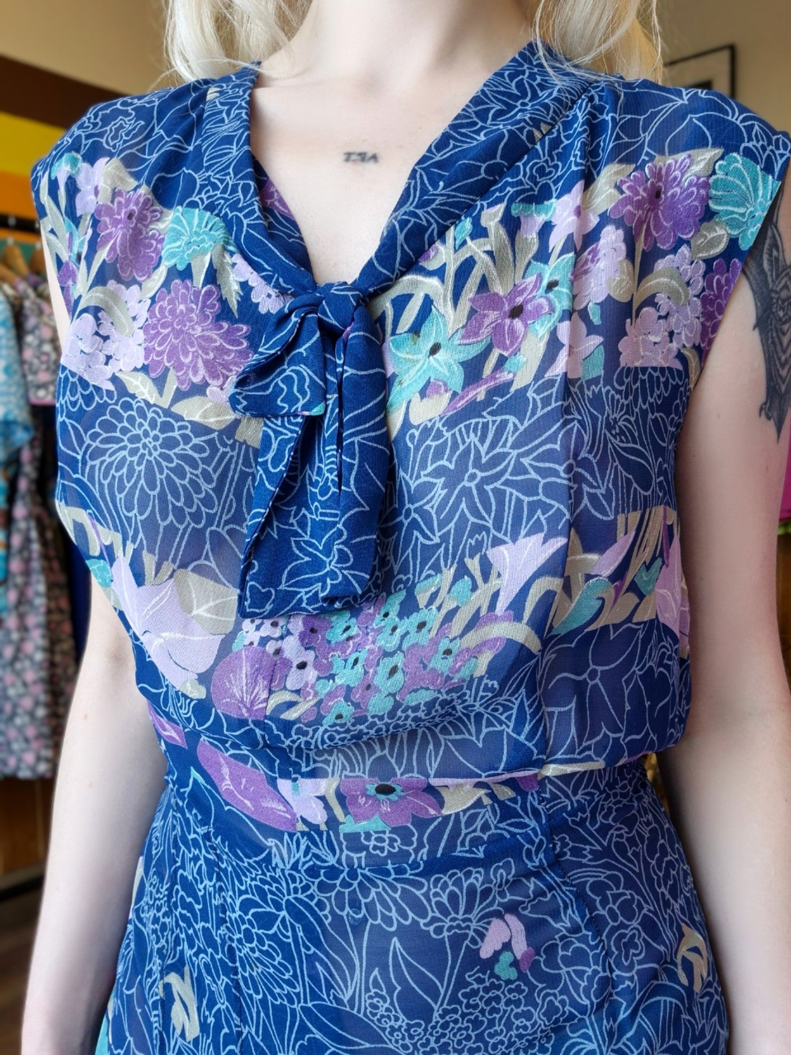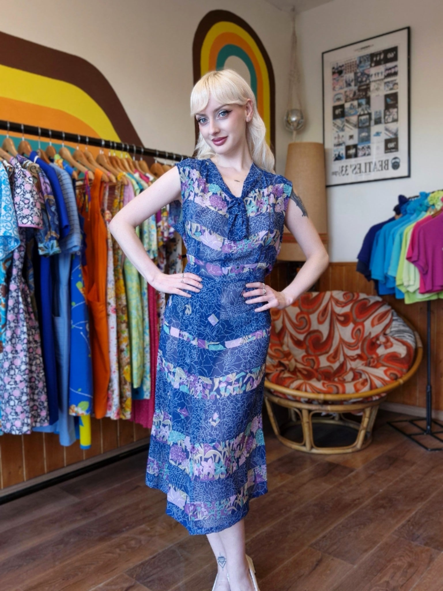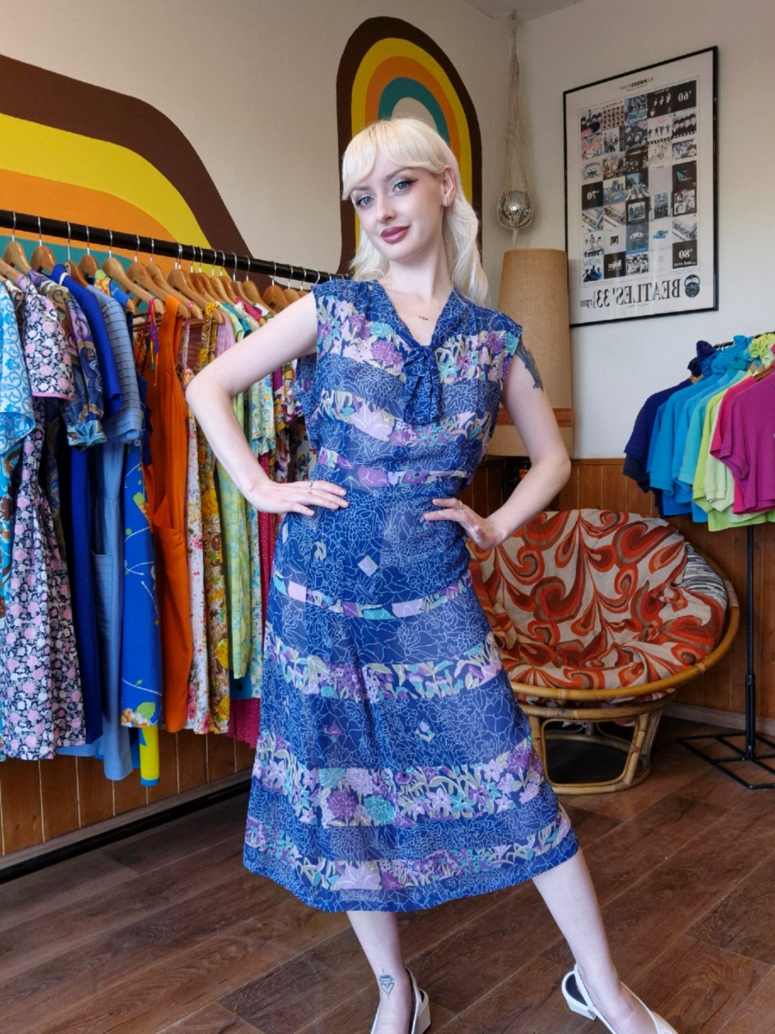 Float through the '70s in this ethereal Jan Pier dress. With soft hues of blue and lavender on sheer fabric, it’s a delicate beauty best paired with your favorite slip.