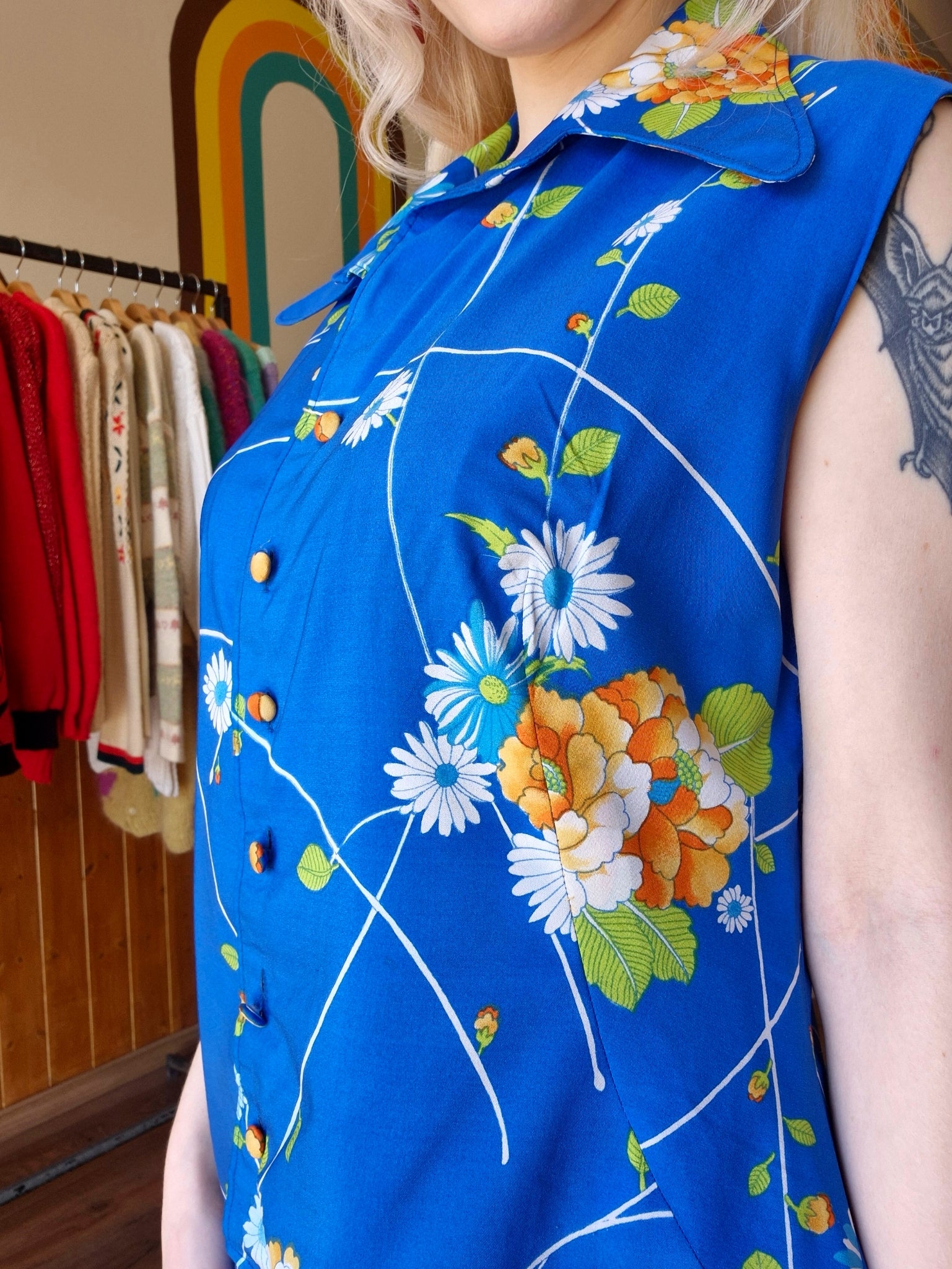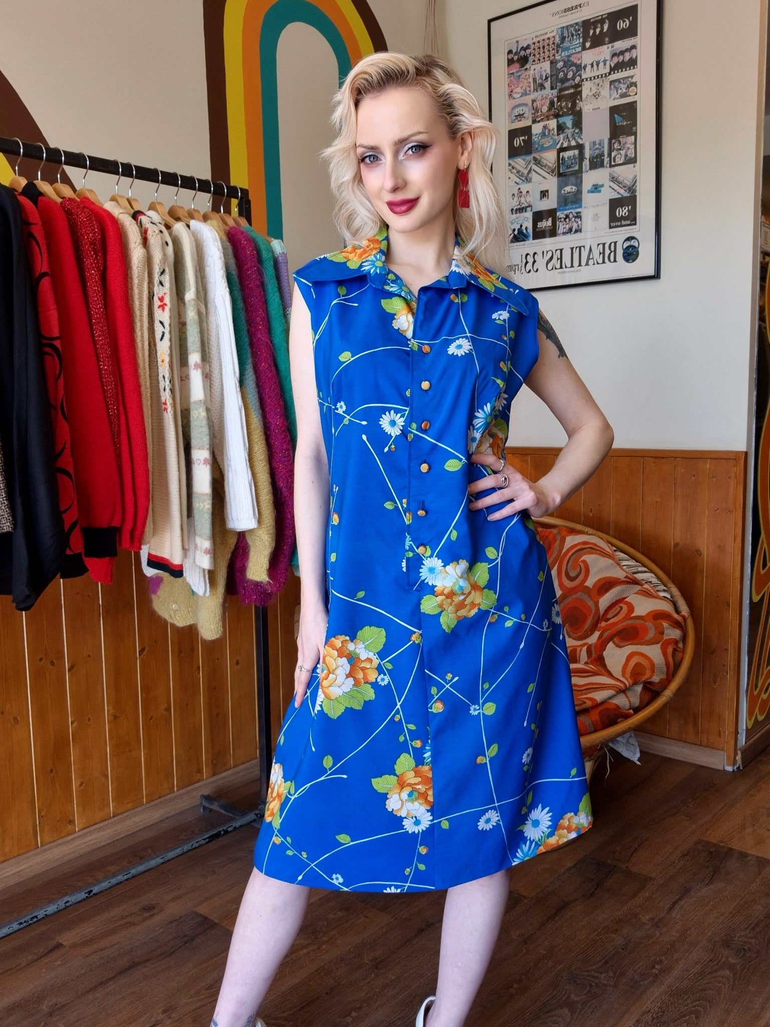 The bold blue tones offer a rich, elegant backdrop for the soft, feminine flowers scattered throughout the dress. Sleeveless and lightweight, it's perfect for warm-weather events, where you can celebrate the beauty of vintage style in full bloom.