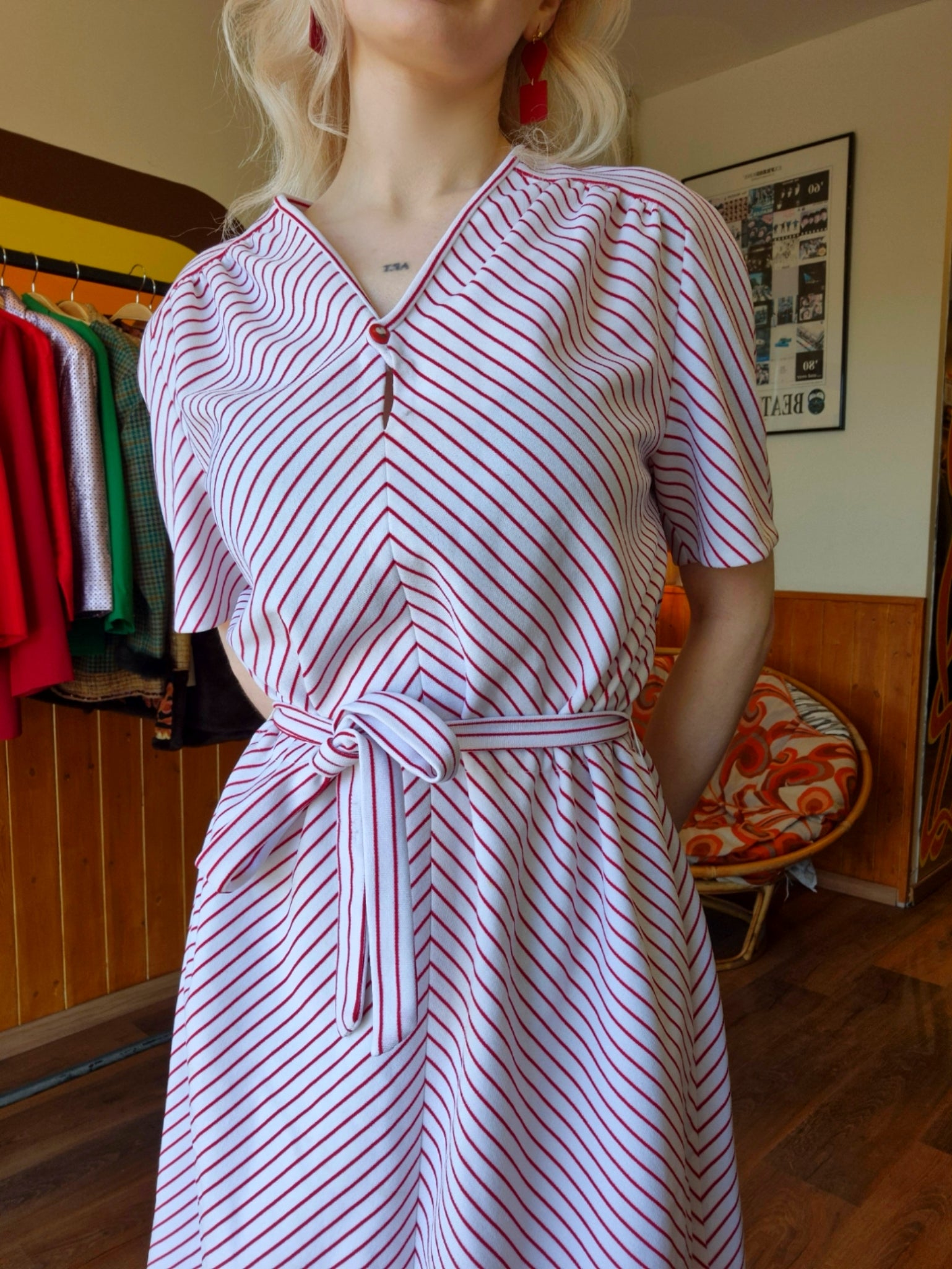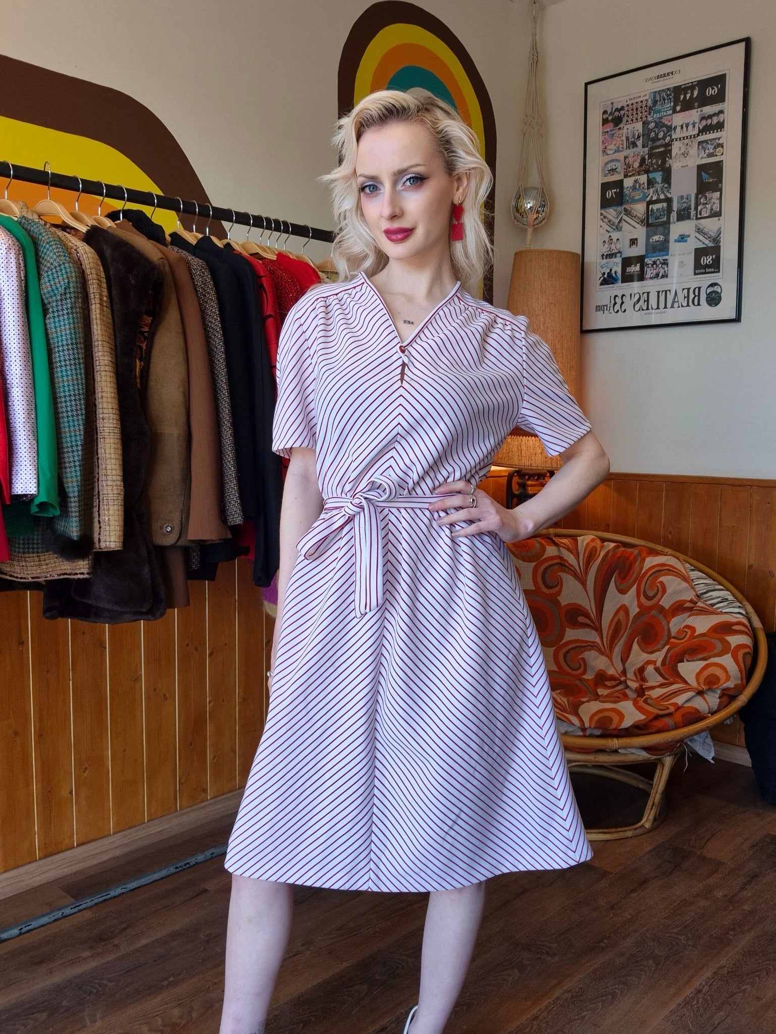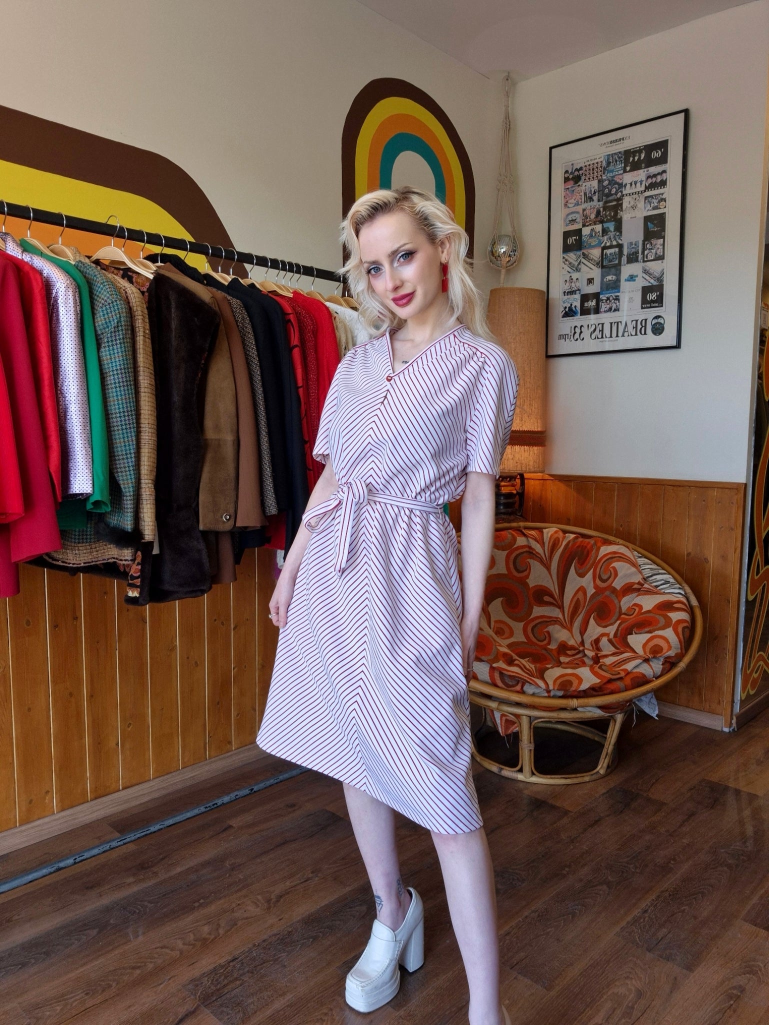 The playful contrast between the vivid red and pure white fabric creates a striking and timeless combination. Designed with effortless vintage appeal, this dress is ideal for those looking to add a pop of colour and vintage class to their wardrobe.