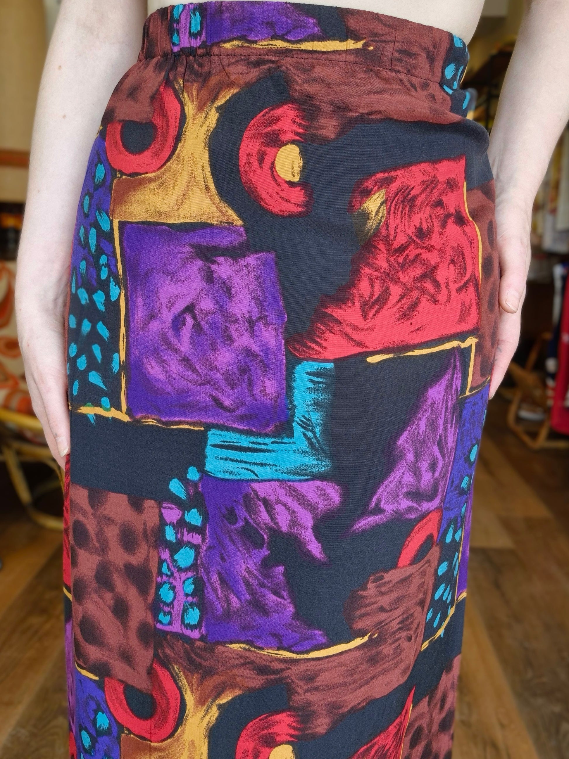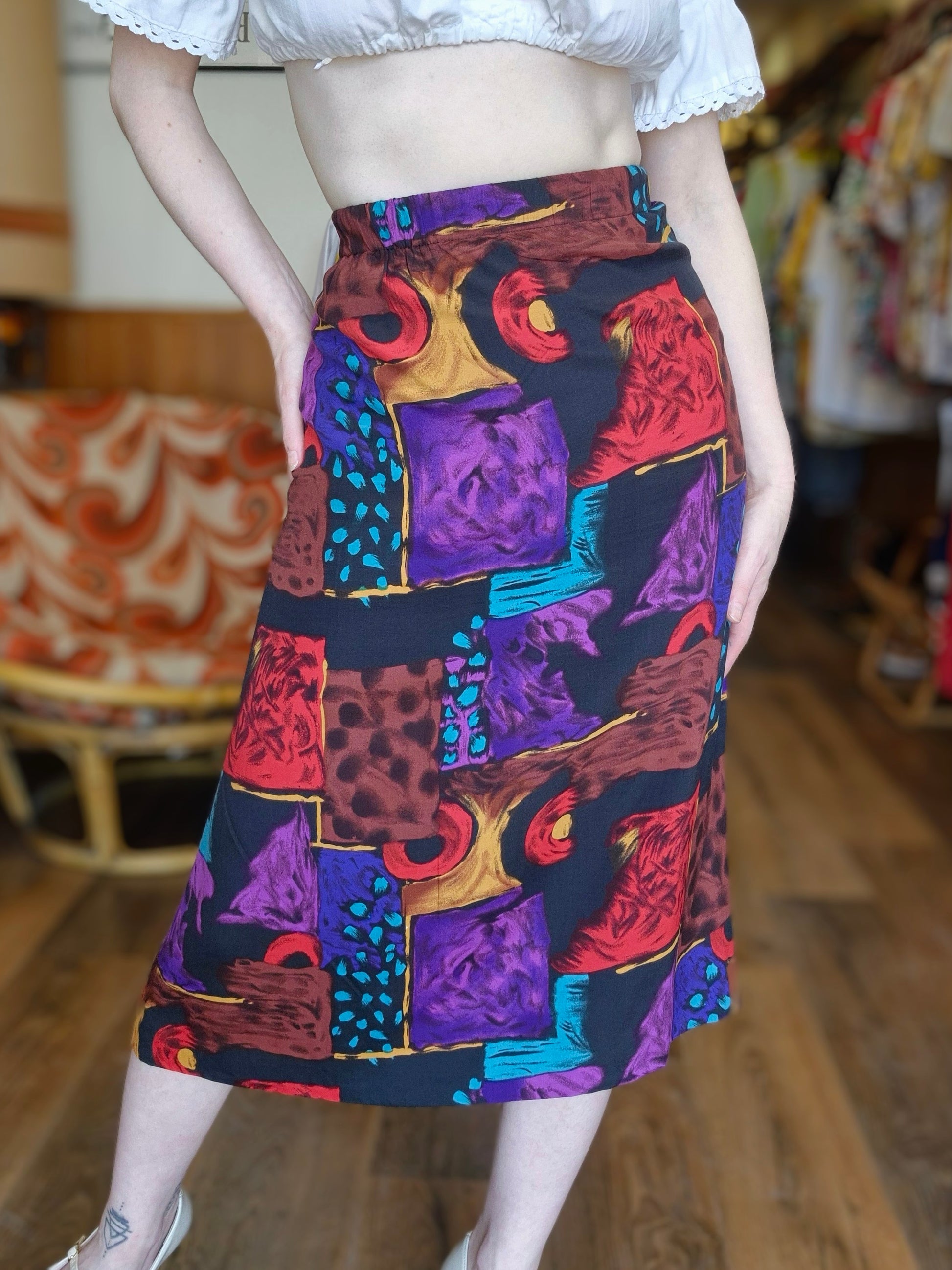A vibrant ‘90s skirt featuring bold, graphic prints. It’s a fun, fearless piece that brings the decade’s colorful energy to life.