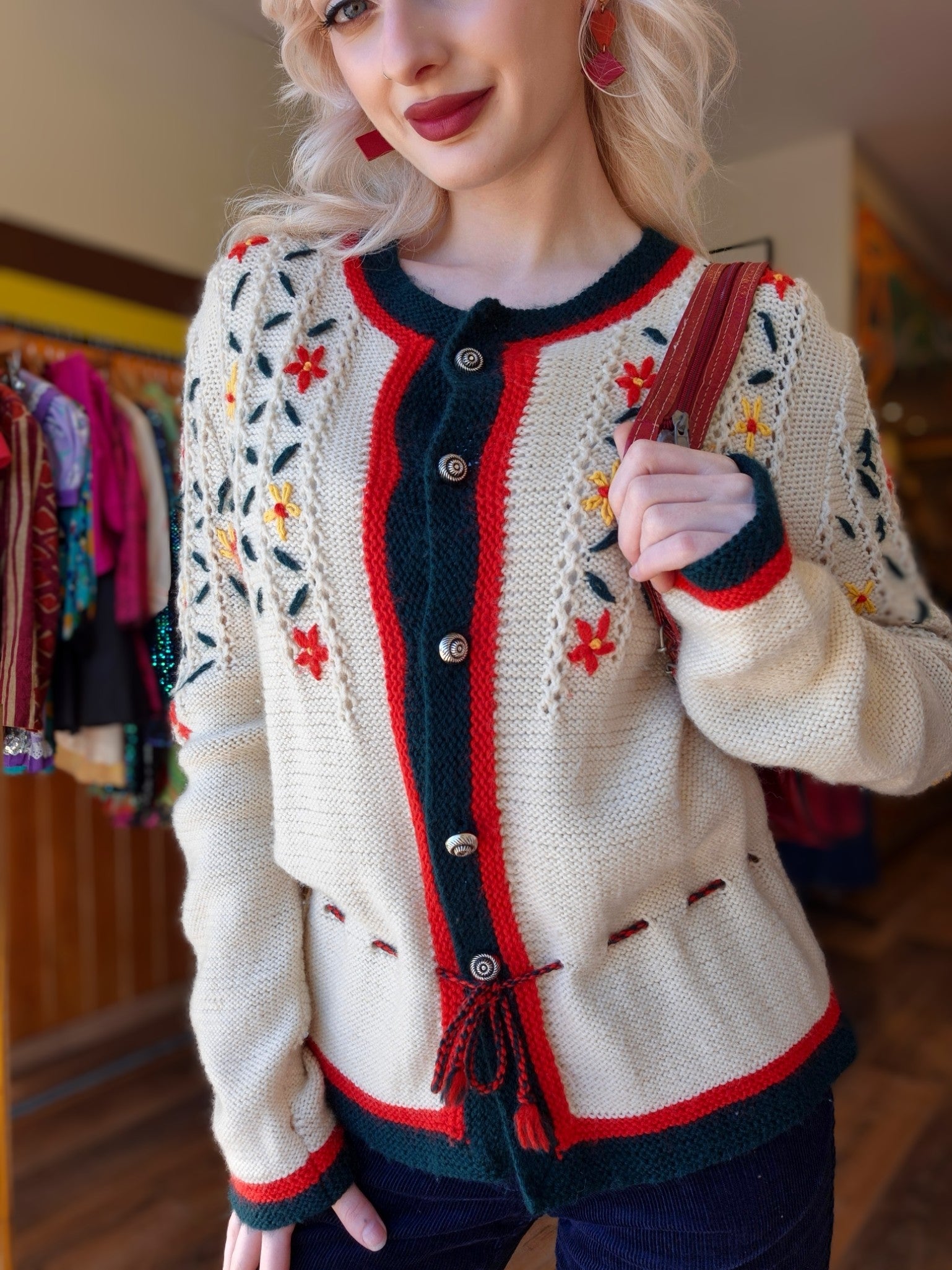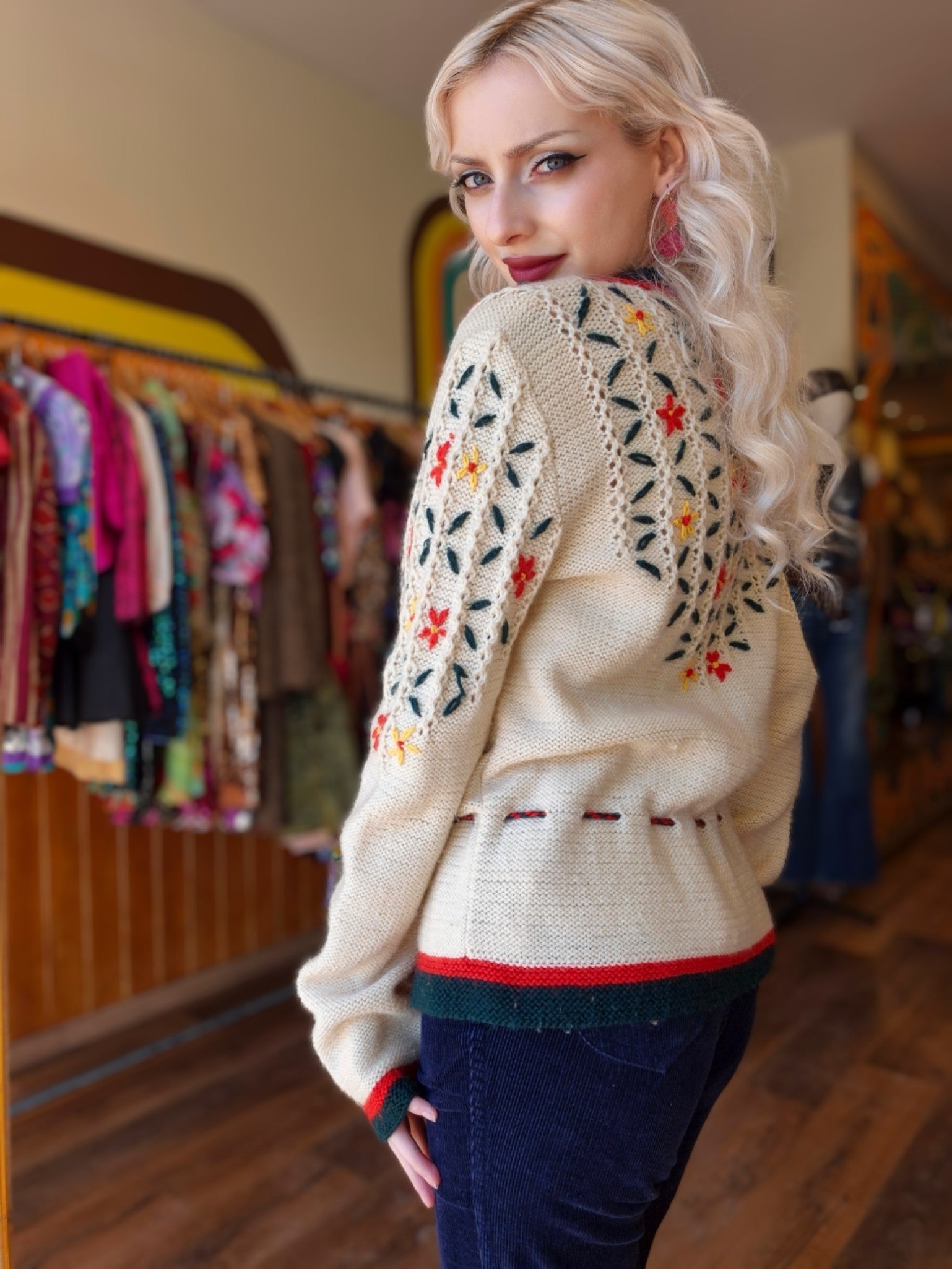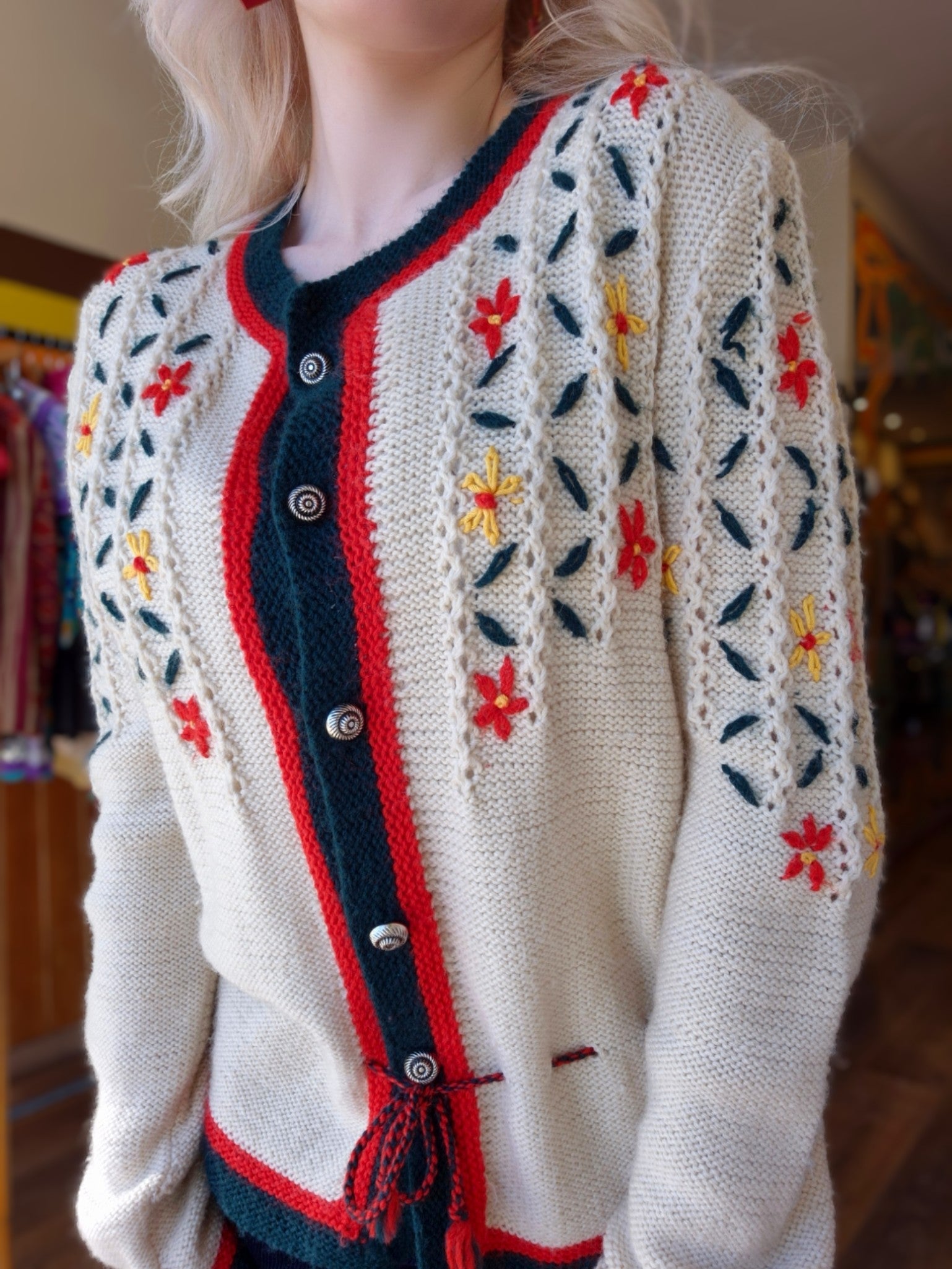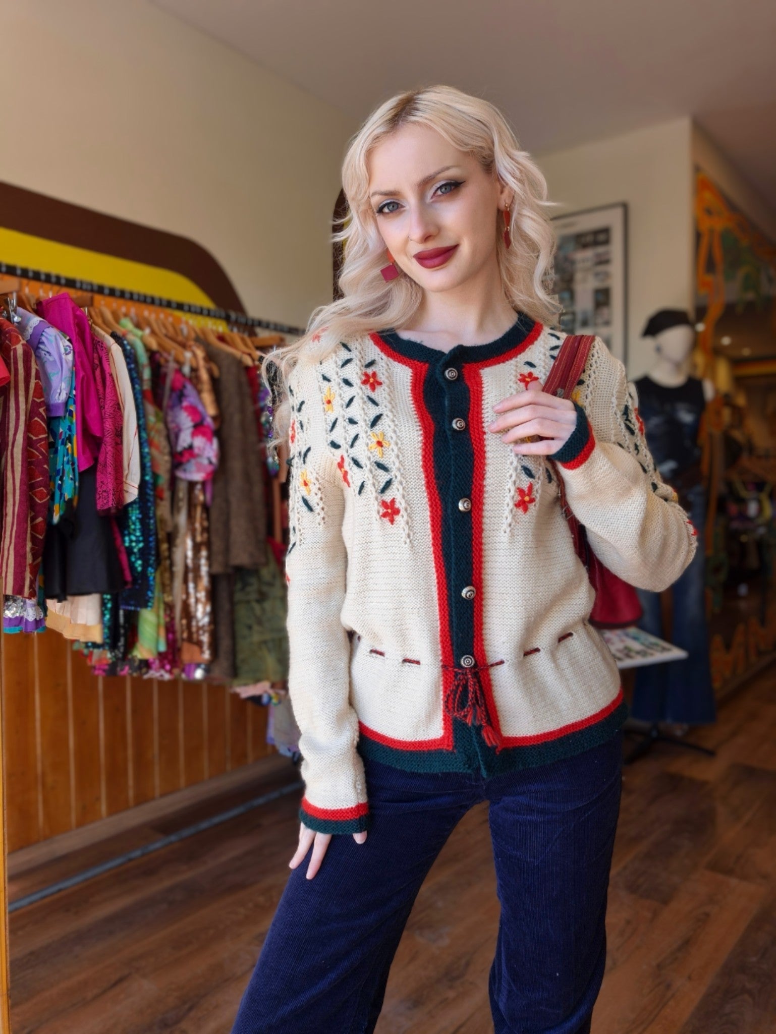 This rare 1970s Austrian Cardigan is the epitome of vintage elegance. With its floral details and timeless knit design, it captures the essence of '70s fashion and craftsmanship. A must-have for anyone seeking a truly unique vintage piece.