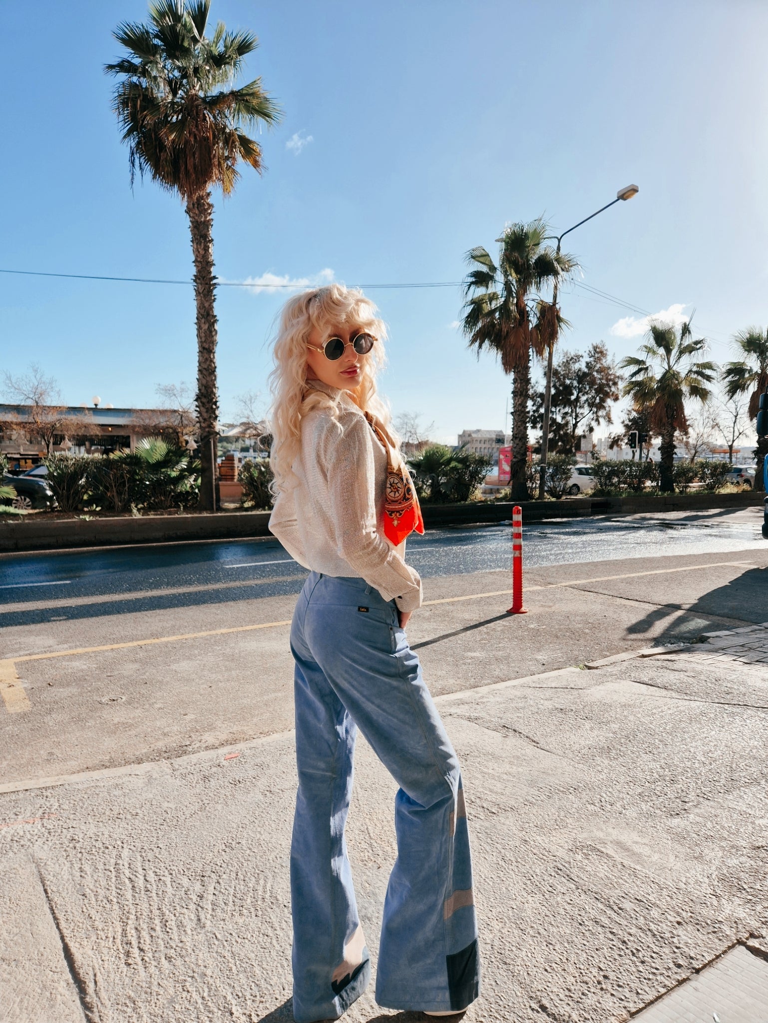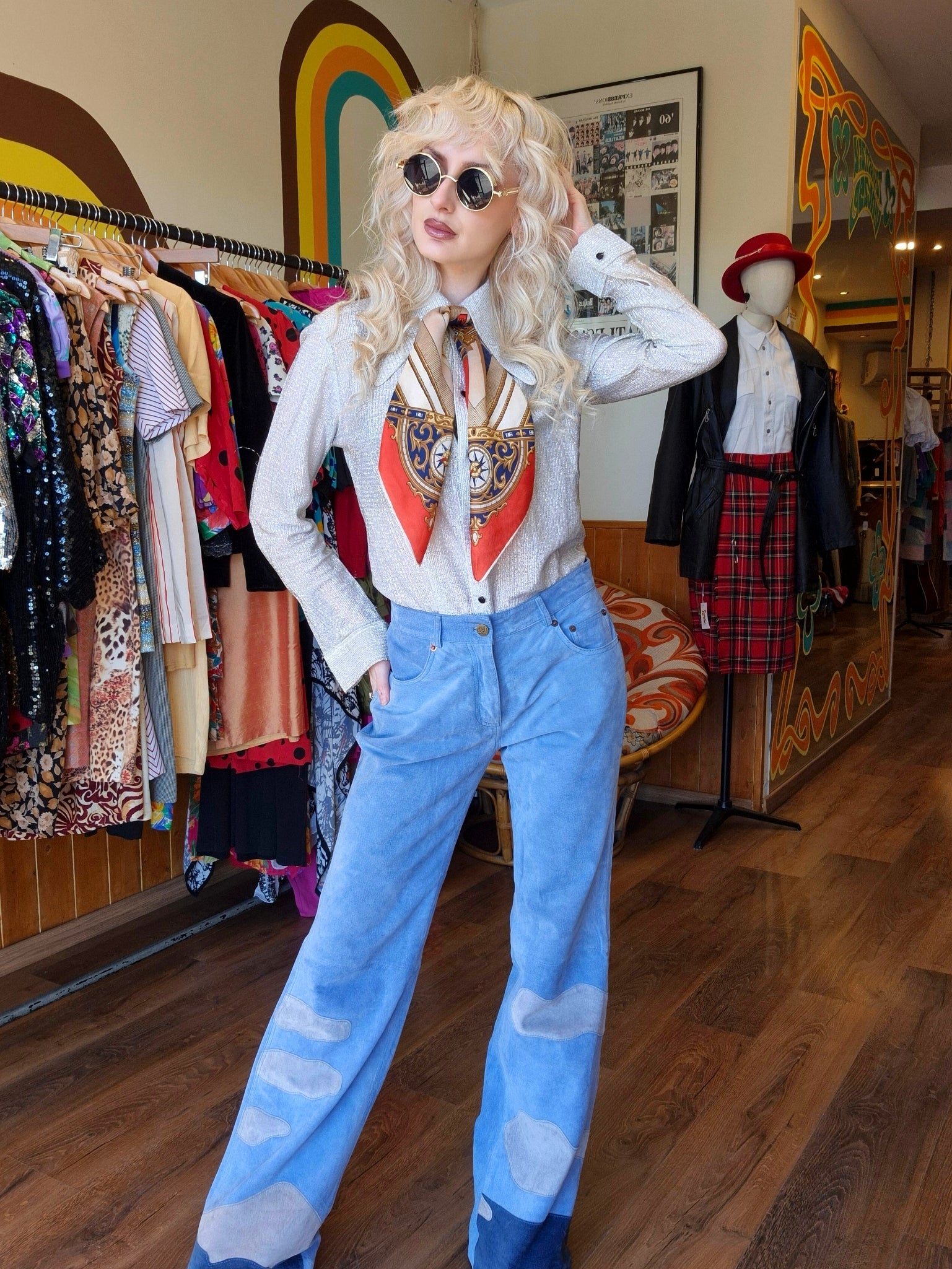 Step into a bold retro vibe with our Blue Suede Bell Bottom Pants. Featuring a soft suede fabric and eye-catching applique details at the bottom of the legs, these pants are a statement piece that brings flair and fun to any outfit. With a flattering bell-bottom silhouette, they capture the essence of '70s style, perfect for anyone who loves to stand out.