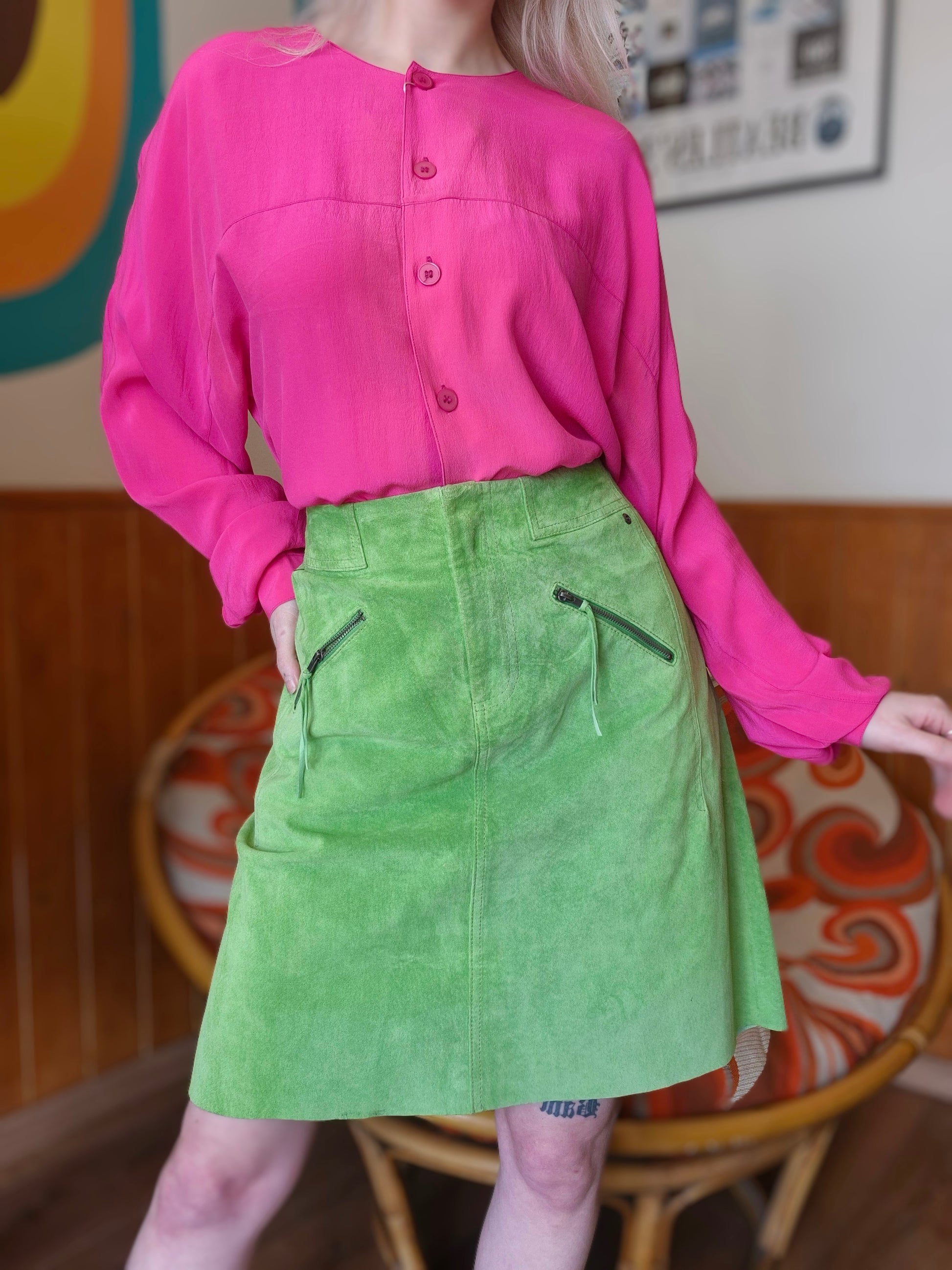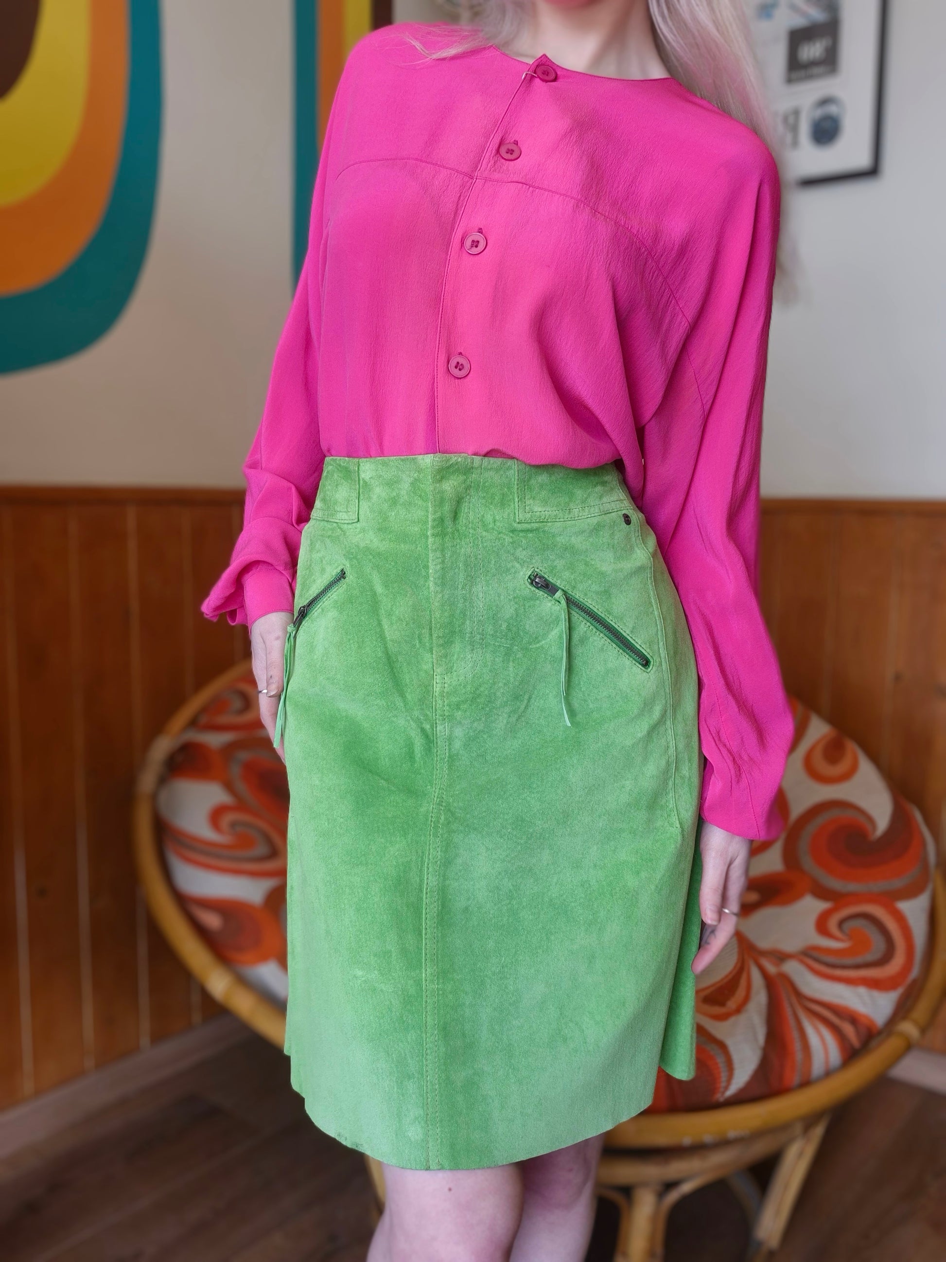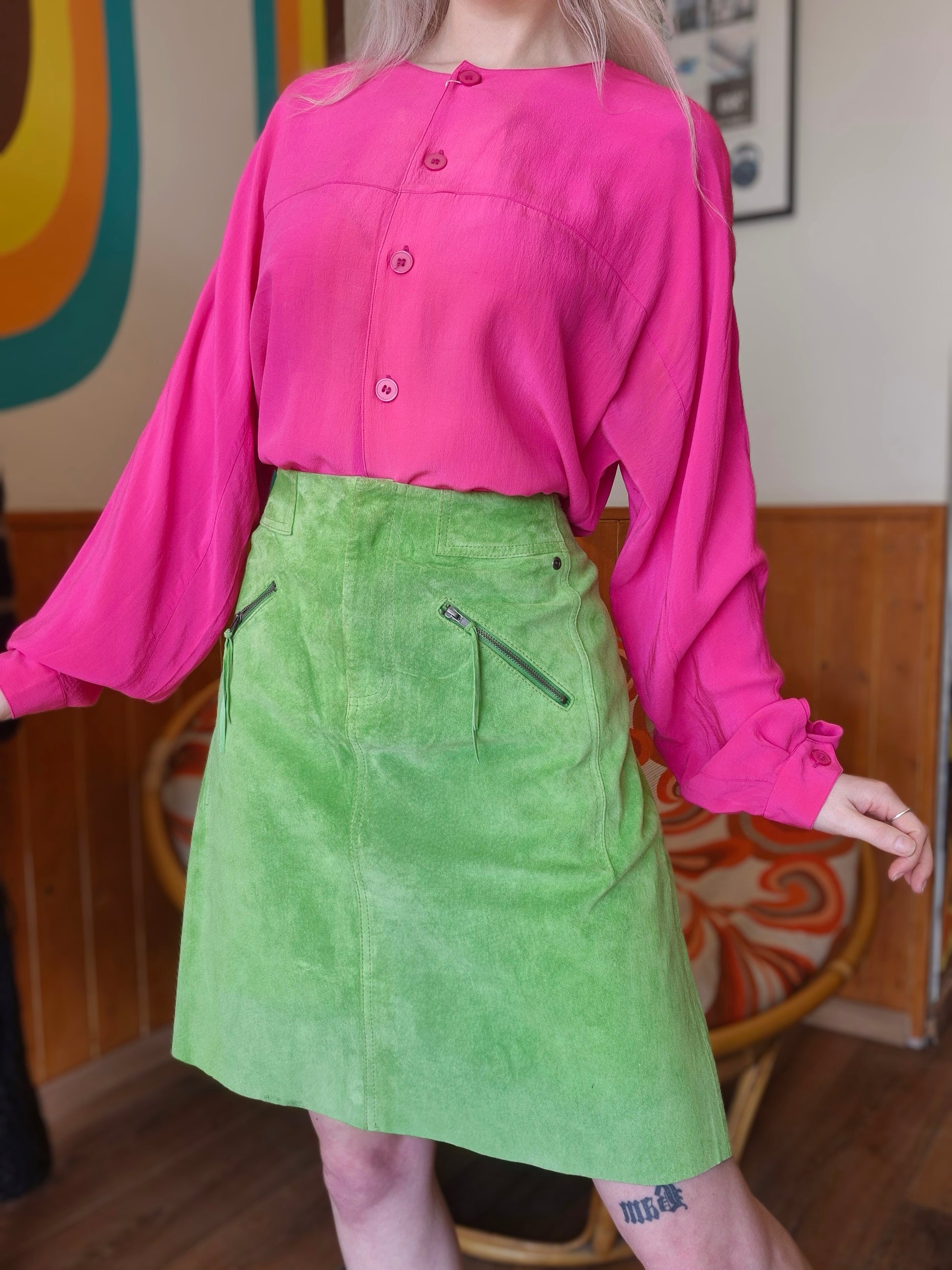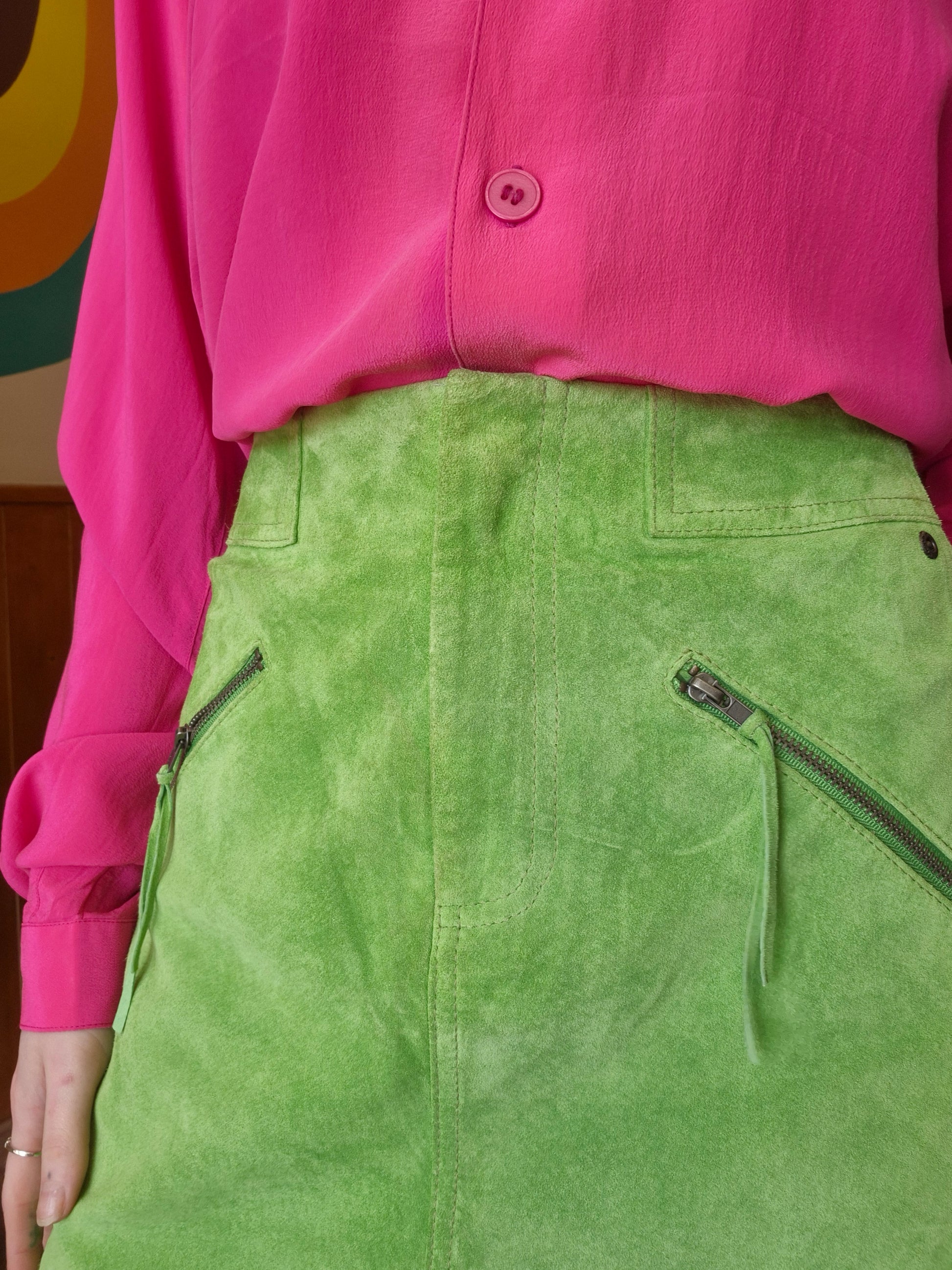 Deadstock suade skirt in this eye catching vibrant green, poket details and pleates in the back, a truley unique skirt, please note our model has clipped this one in the back so it is larger in size, please check the measurments (this goes for all of our profducts) we are always happy to send more pictures of our products, simply pop us a message via our instagram or facebook page.