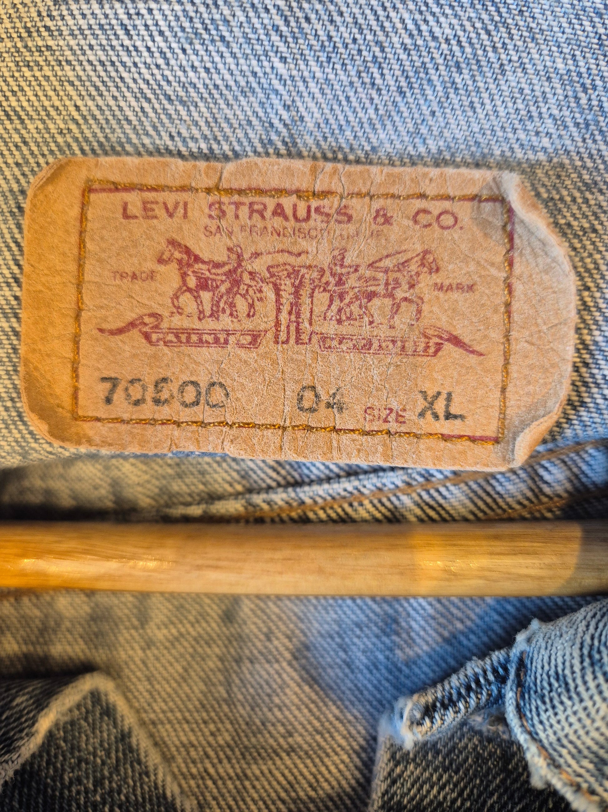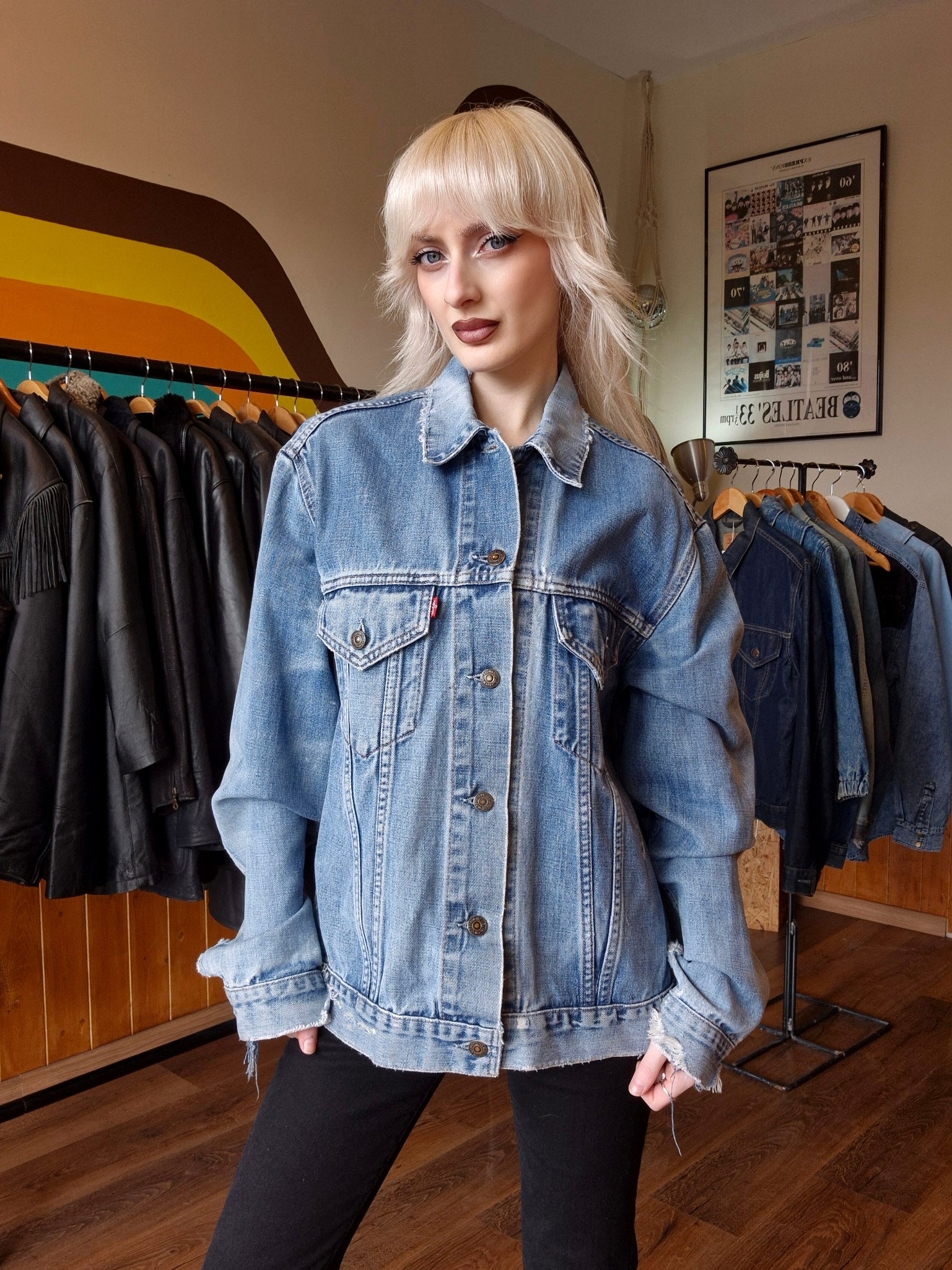 Make a bold statement with this distressed and handpainted Levi’s Denim Jacket, featuring the iconic 'Wish You Were Here' lyric on the back. A unique tribute to the classic song, this one-of-a-kind jacket is perfect for anyone who appreciates music and art in fashion.
