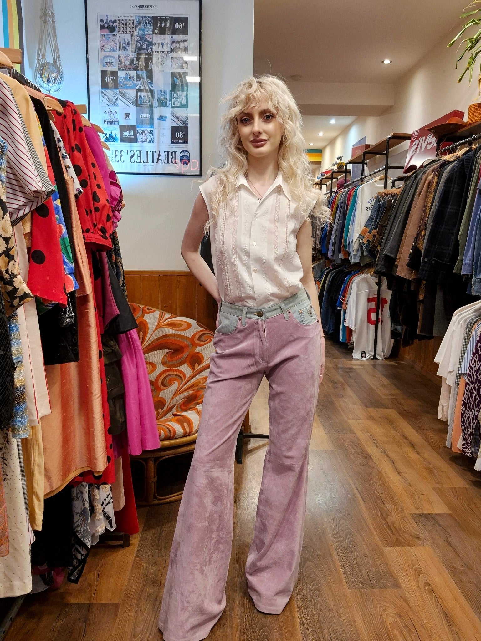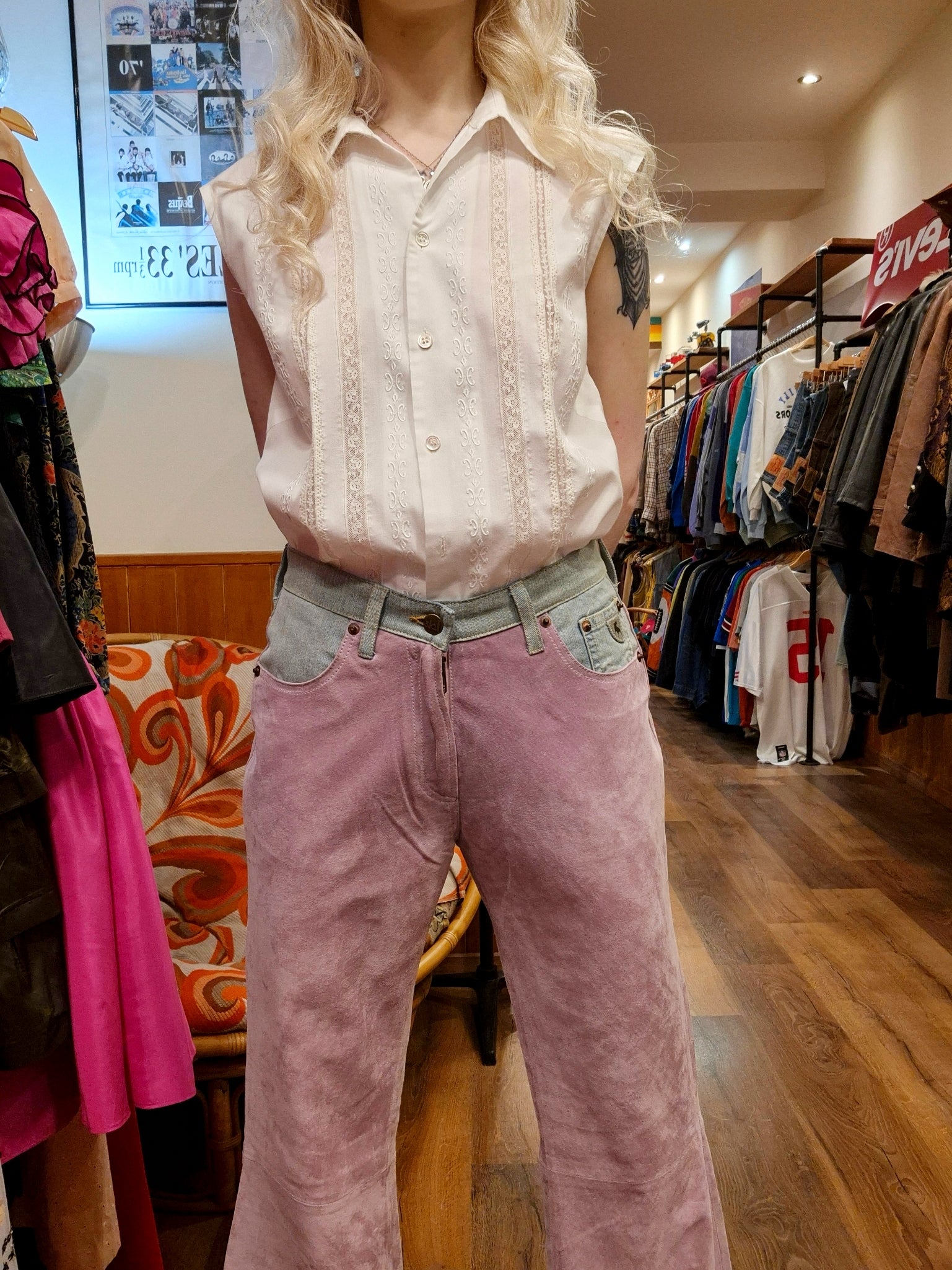 A striking combination of buttery-soft pink suede and denim, these pants are sure to make a statement, buttery soft, flared leg. Deadstock Meaning that they are Vintage but still New.