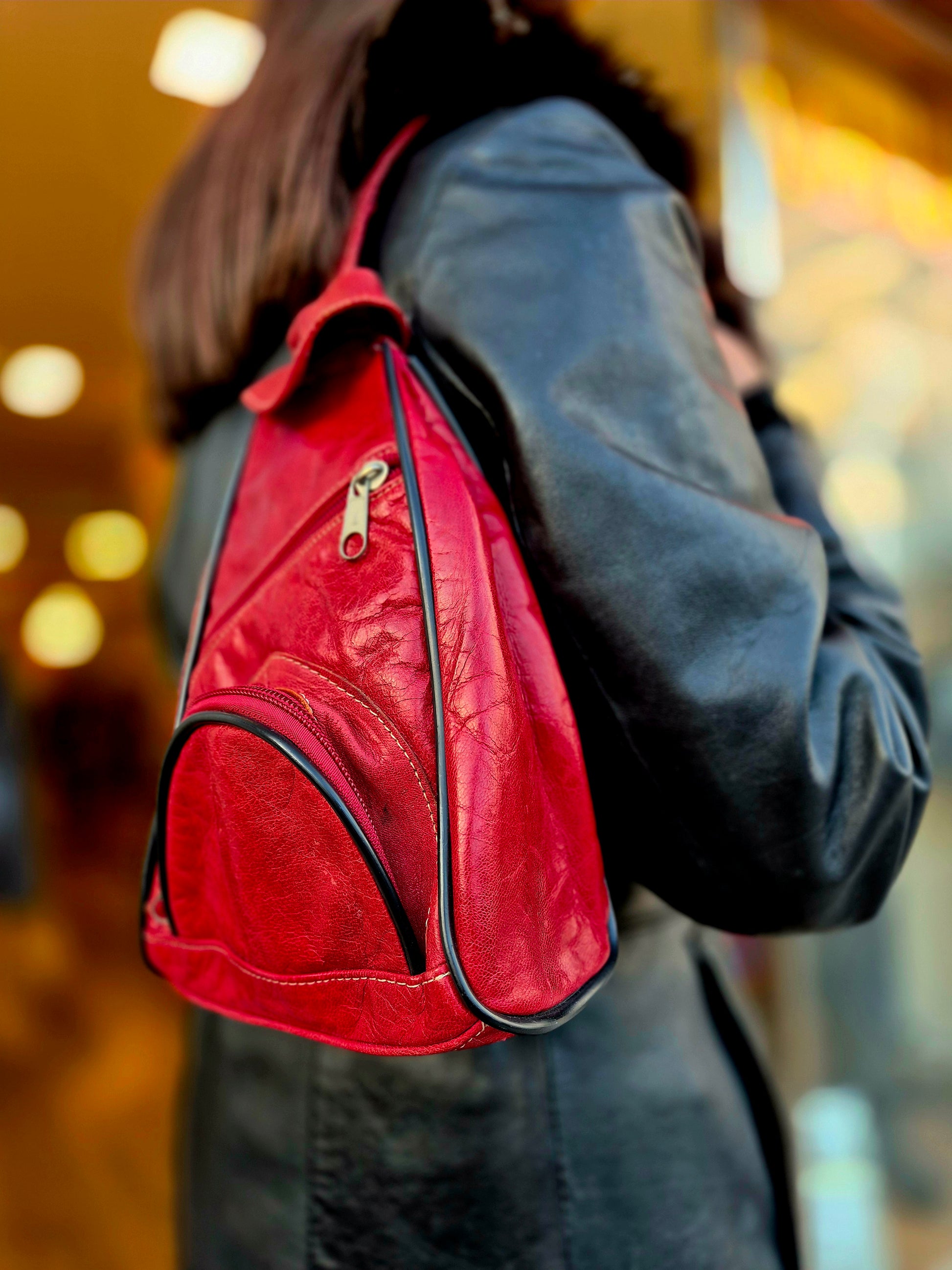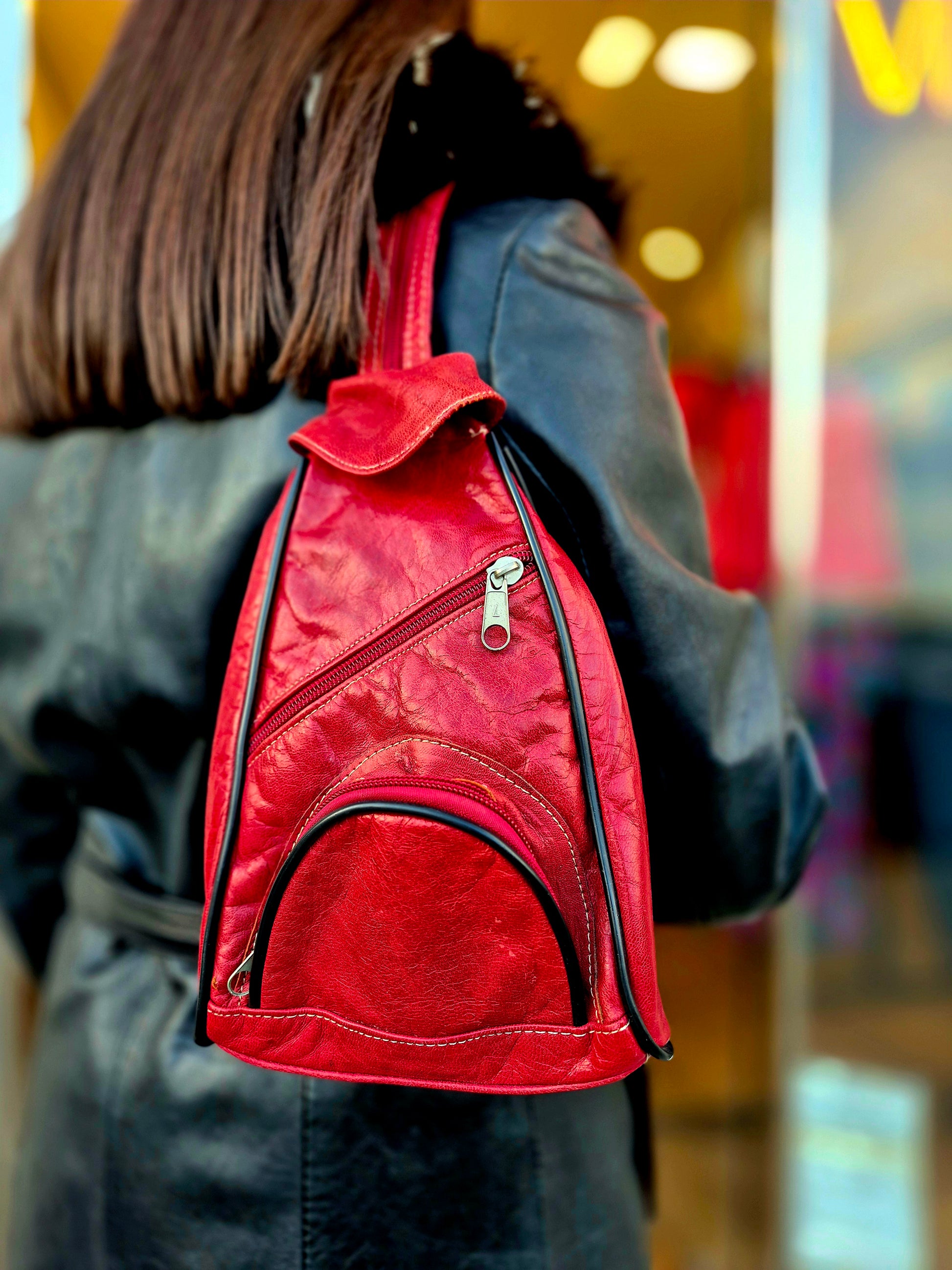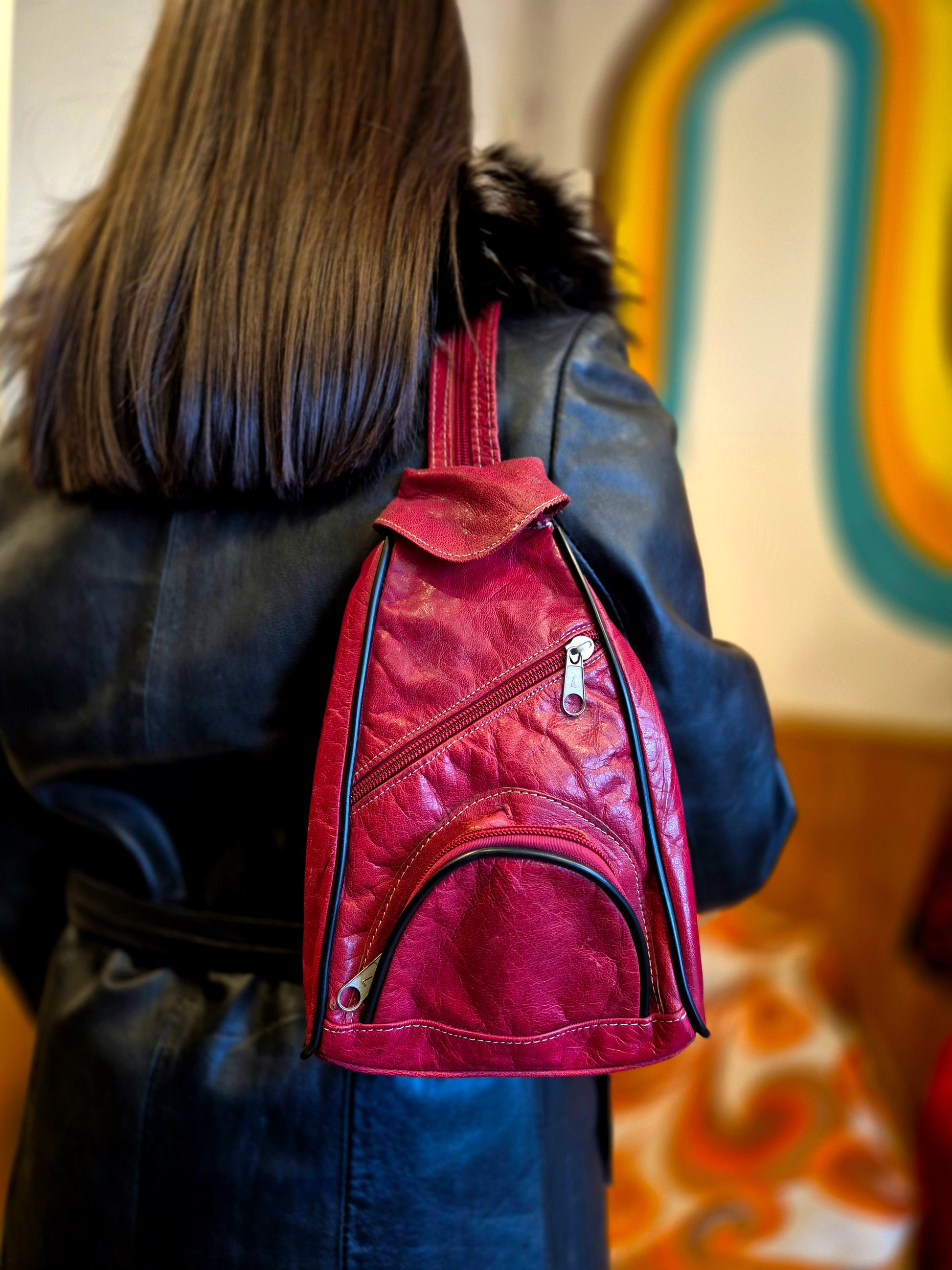 For those who prefer a more compact option, the Small Red Leather Backpack is a chic choice. Made from soft, high-quality leather, its vibrant red colour and minimalist design make it perfect for quick outings or casual days when you need to carry just the essentials.This Bag has been worn in, it is in fair vintage condition that the price reflects.