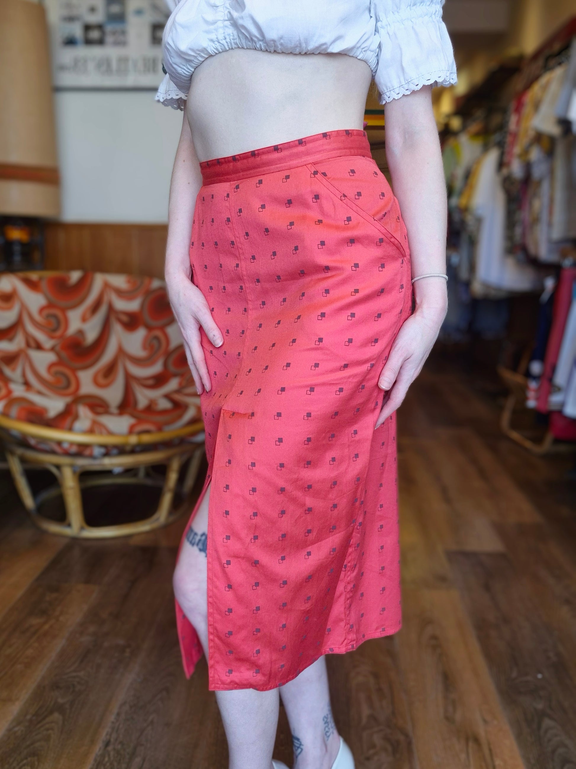 Red, retro, and just a bit unexpected — this vintage pencil skirt with small square details is a total winner. It’s versatile, flattering, and ready to make any outfit feel a little more special.