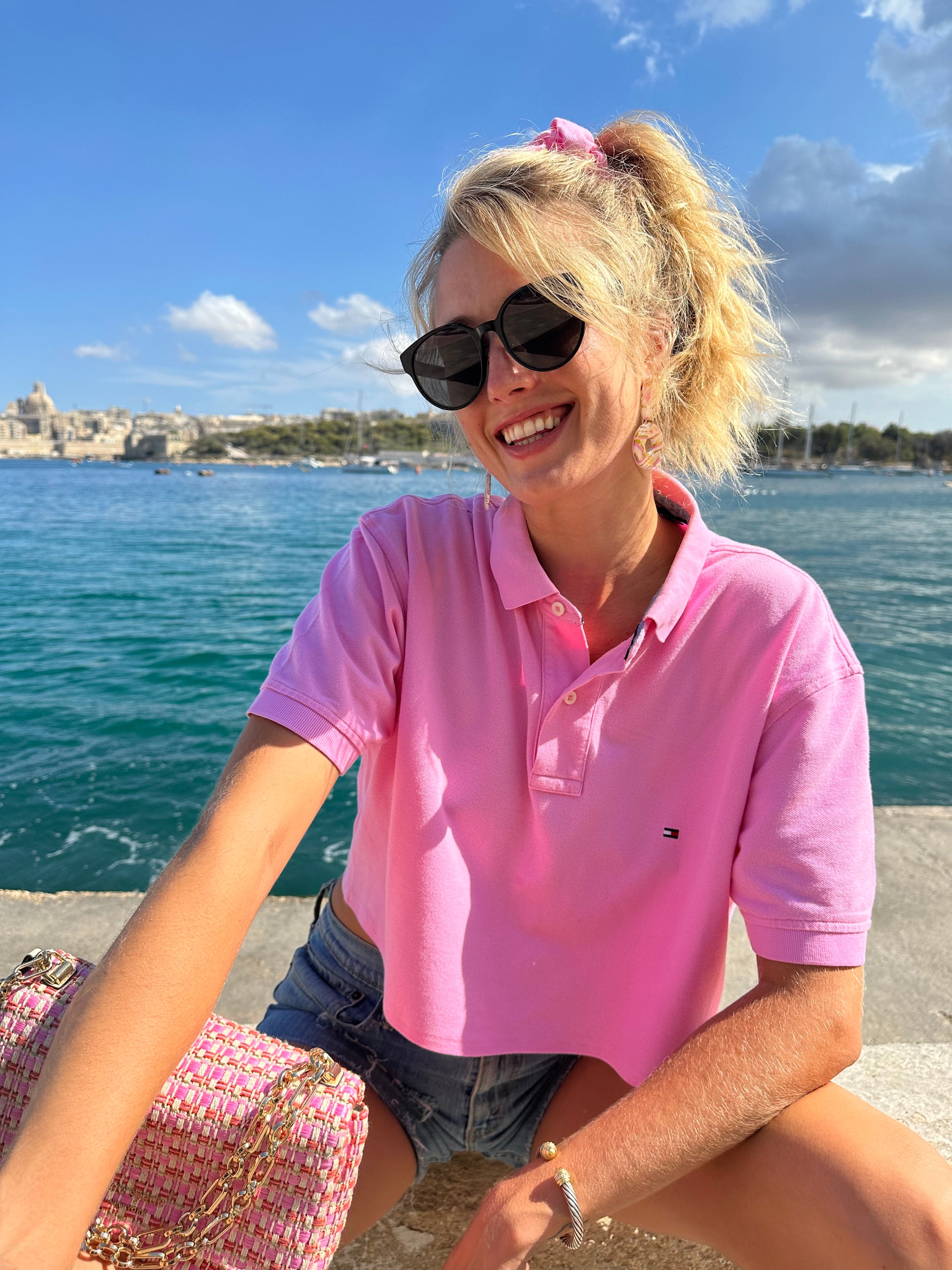 Reworked Tommy Hilfiger polo in pink with matching scrunchie.