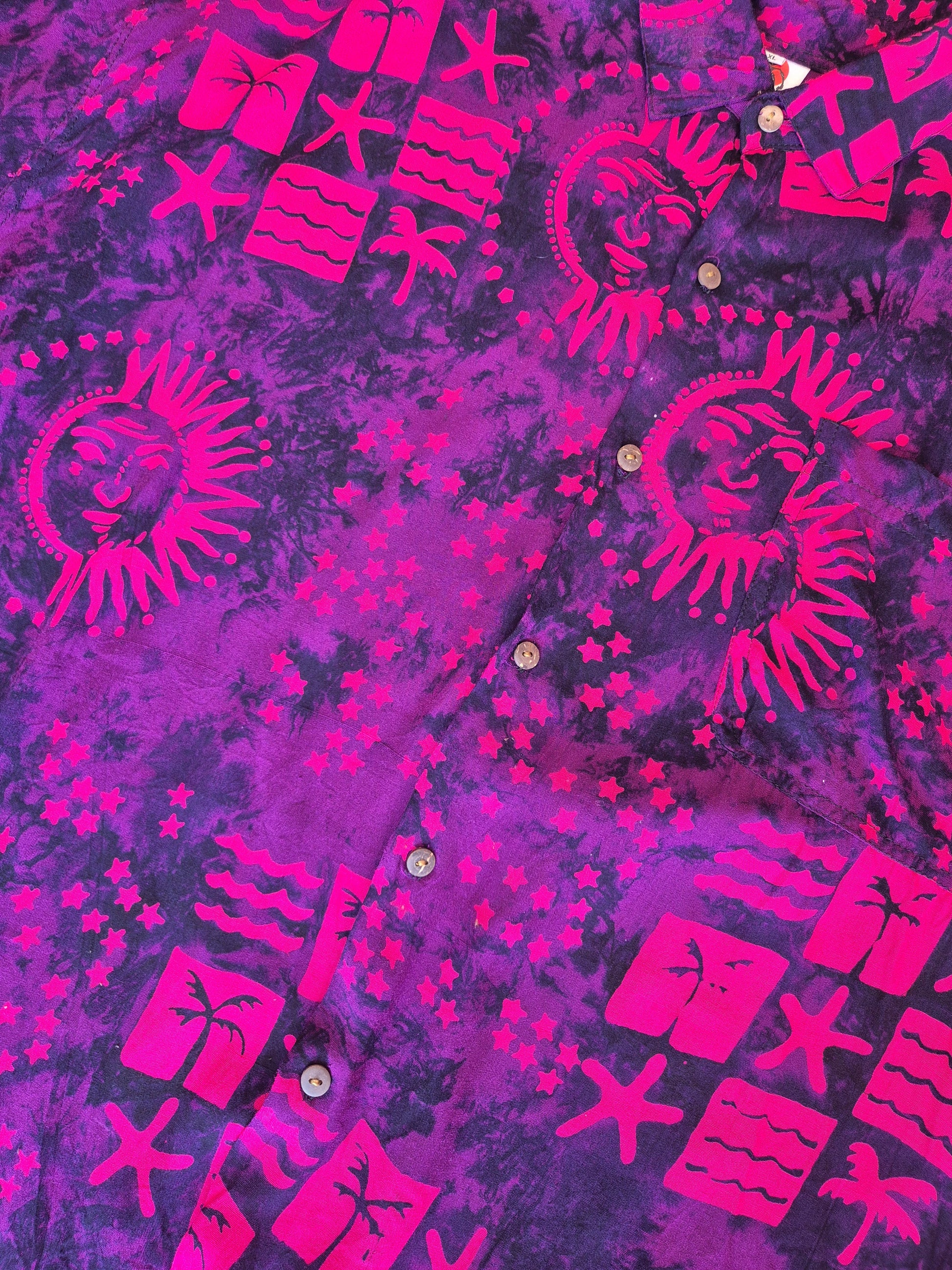 Featuring a vivid hot pink island-inspired print on a deep purple-black marbled base, this shirt is giving full-on 90s rave meets beach vacation energy.