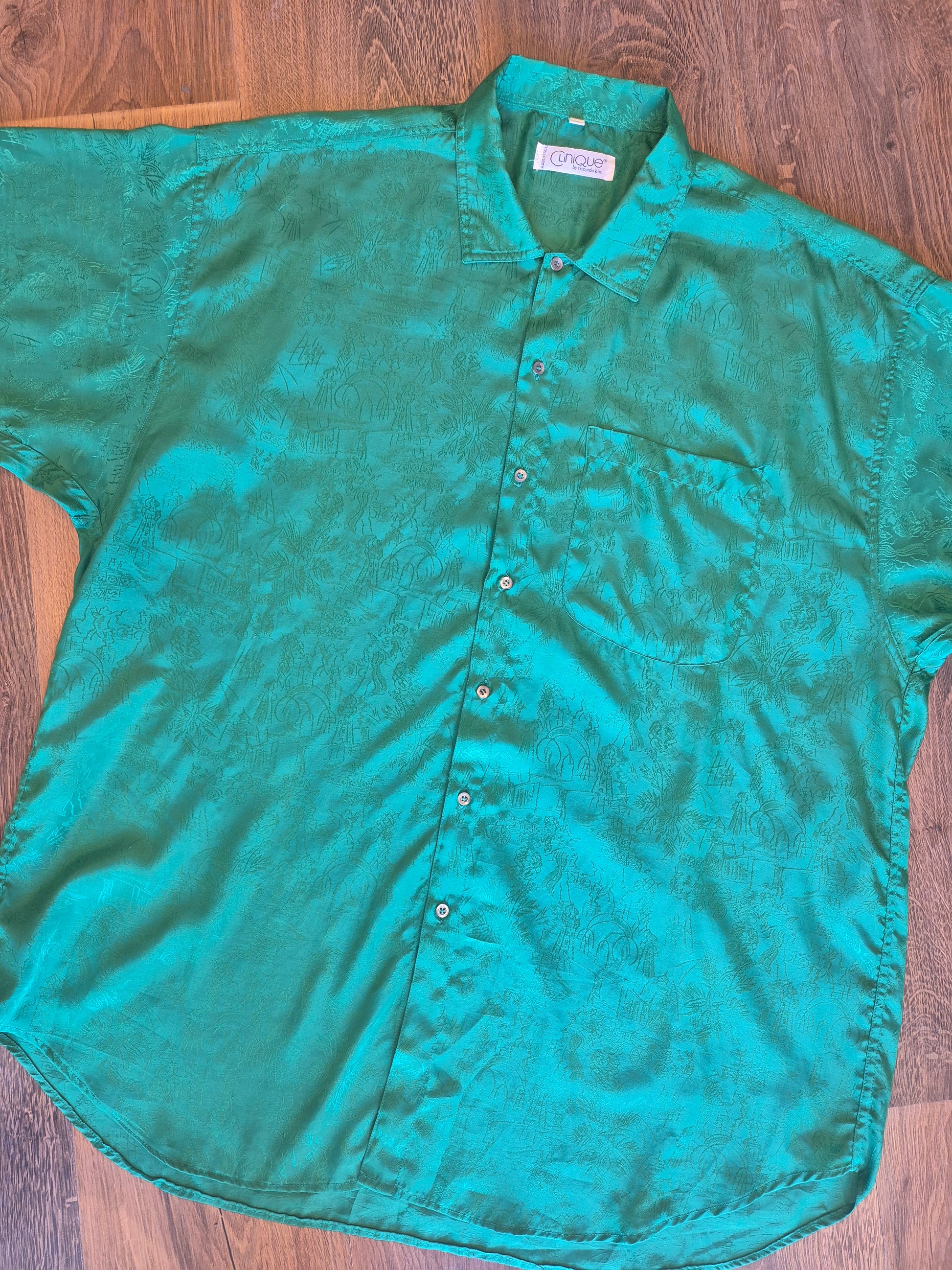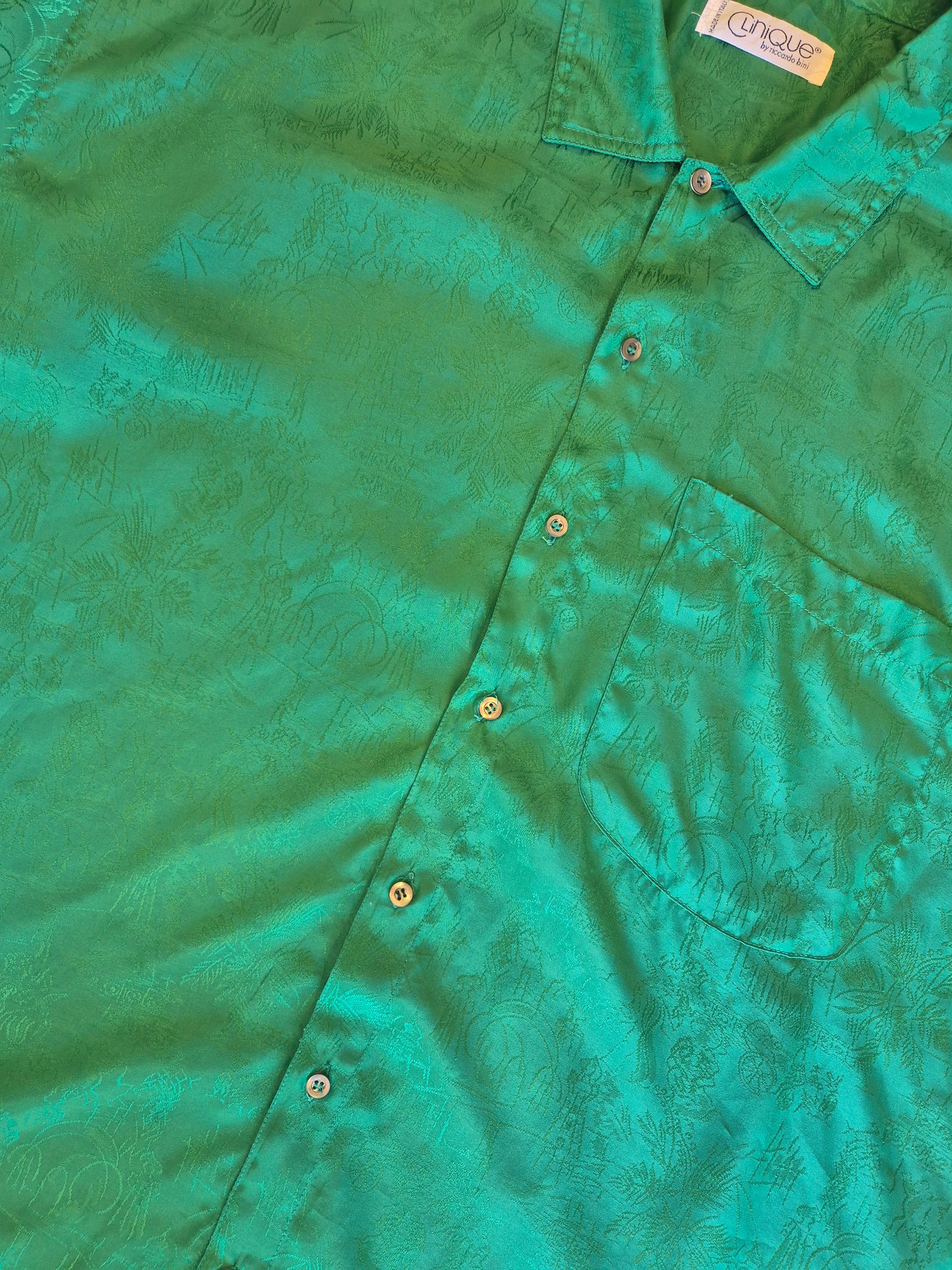 Smooth, sleek, and subtly statement-making, this vintage emerald green satin shirt is a true gem.
