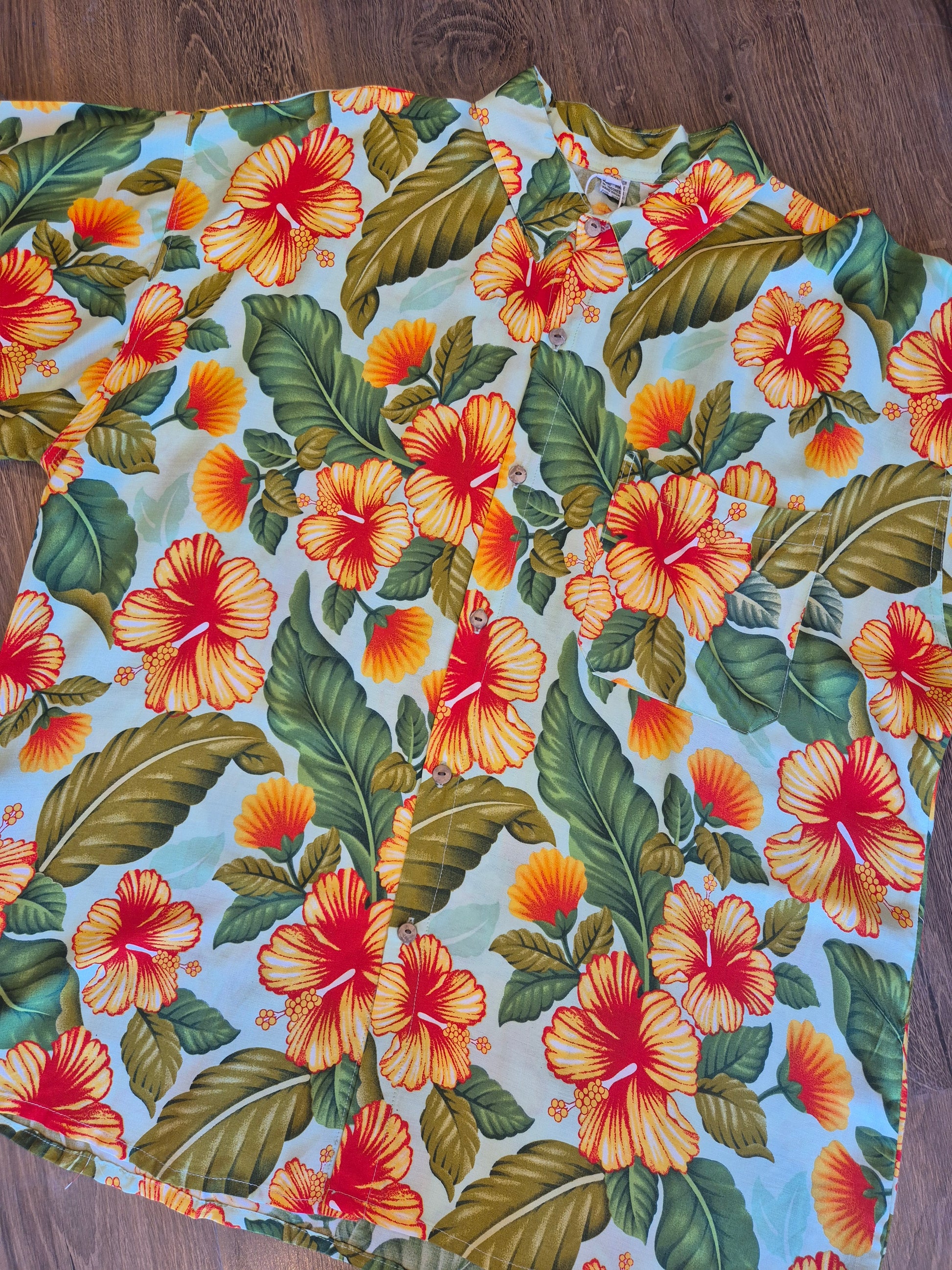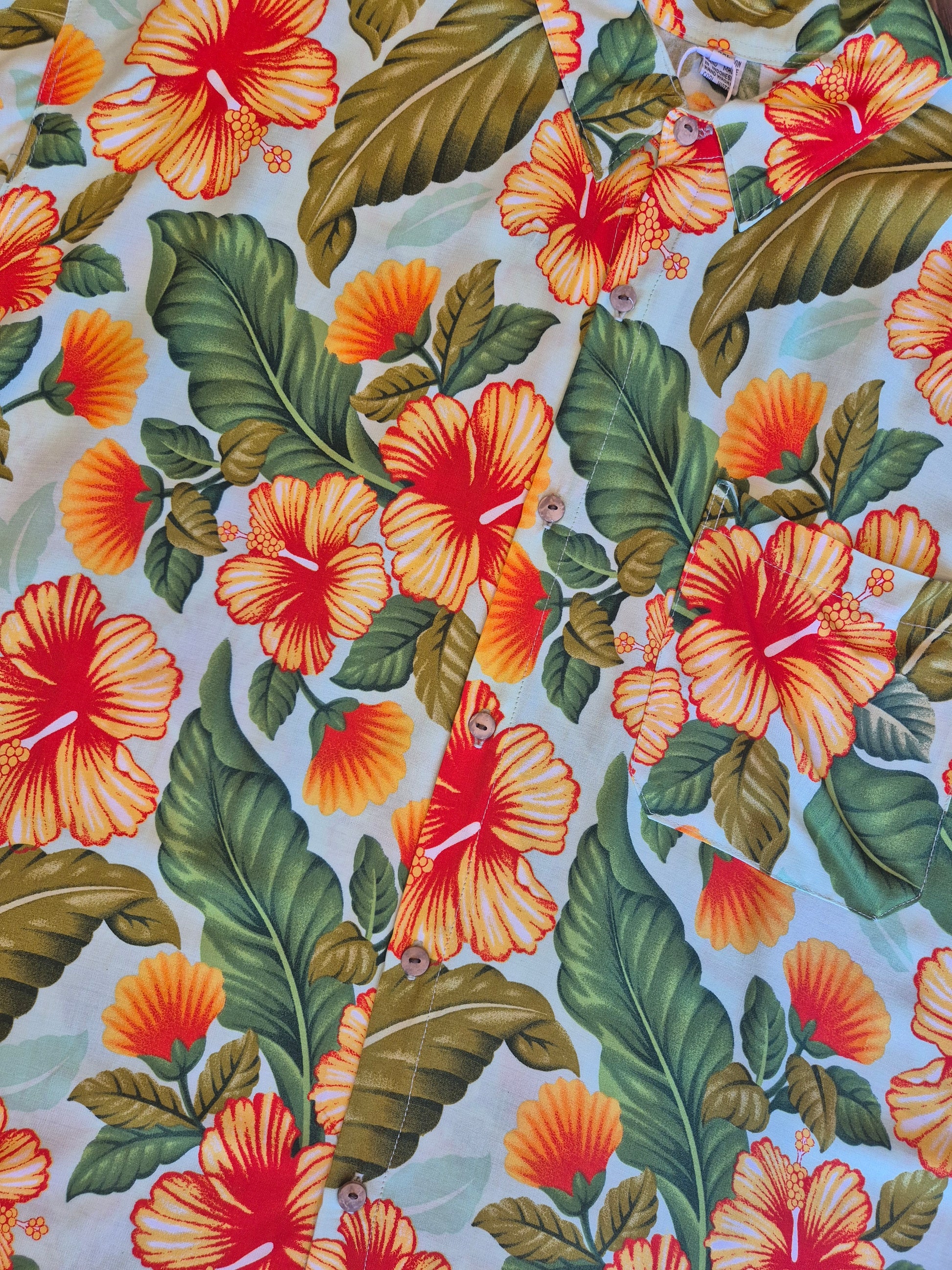 Aloha shirt bursting with fiery red and orange hibiscus blooms, layered over soft tropical green leaves.