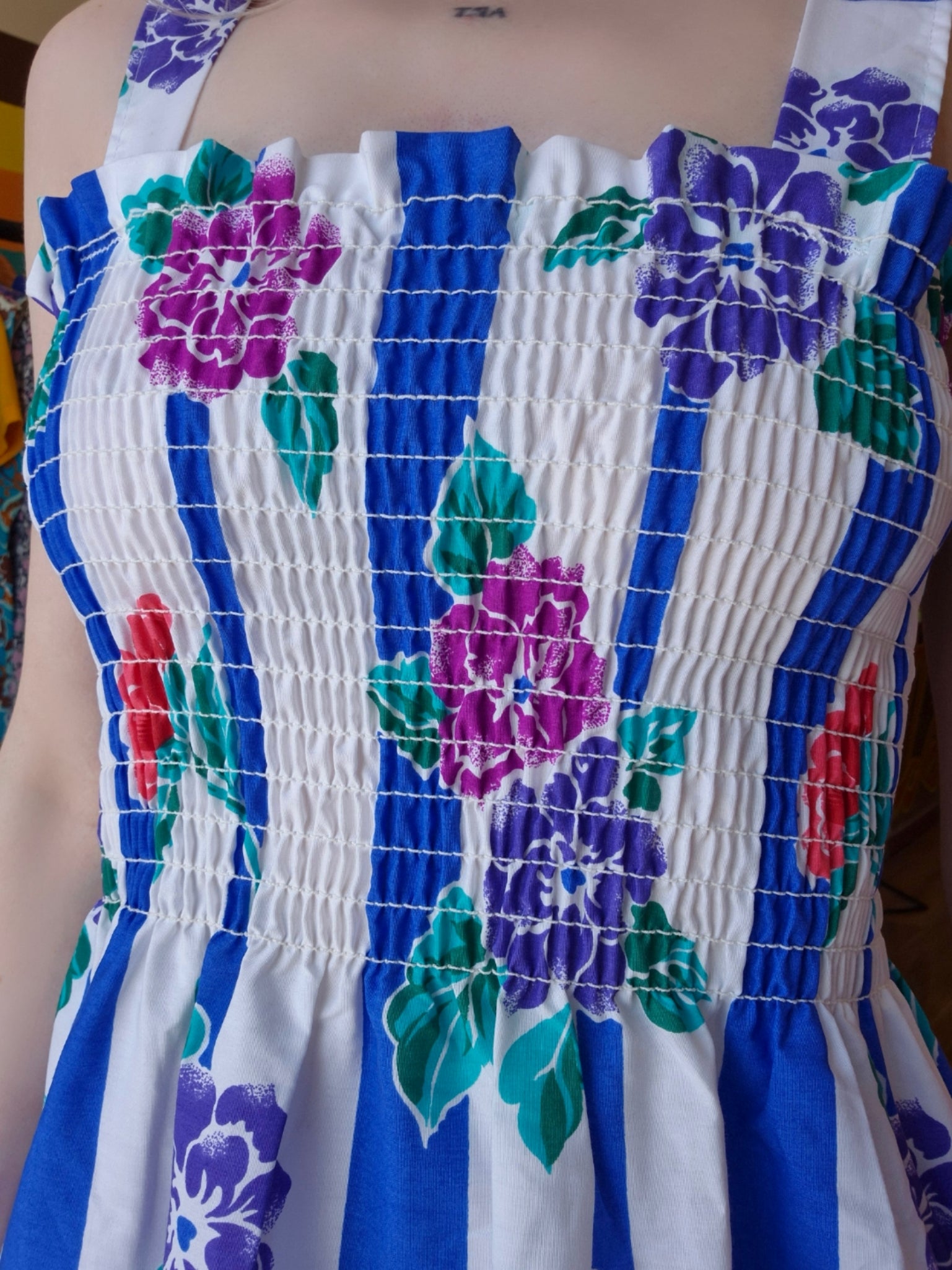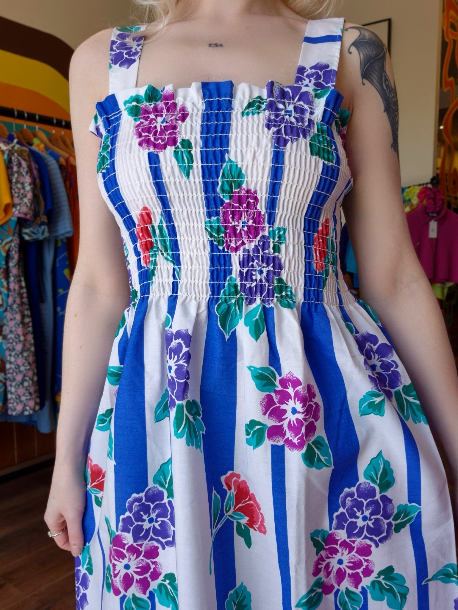 Florals dance between blue-and-white stripes in this vintage dress that’s equal parts charm and comfort. A must-have for lovers of romantic, easygoing vintage style.