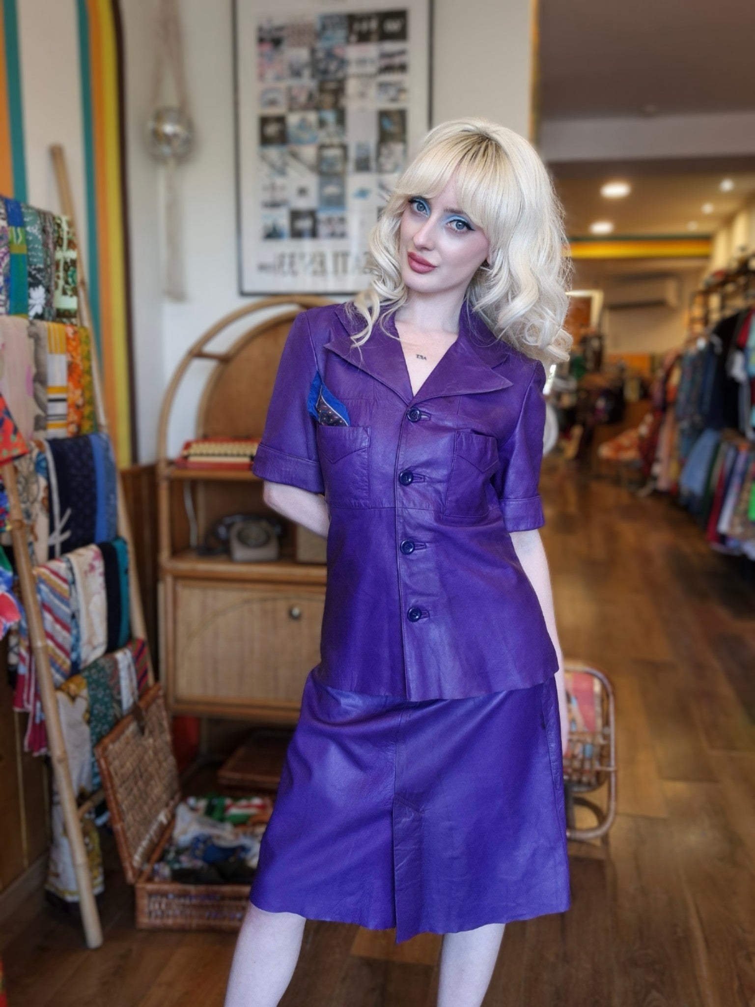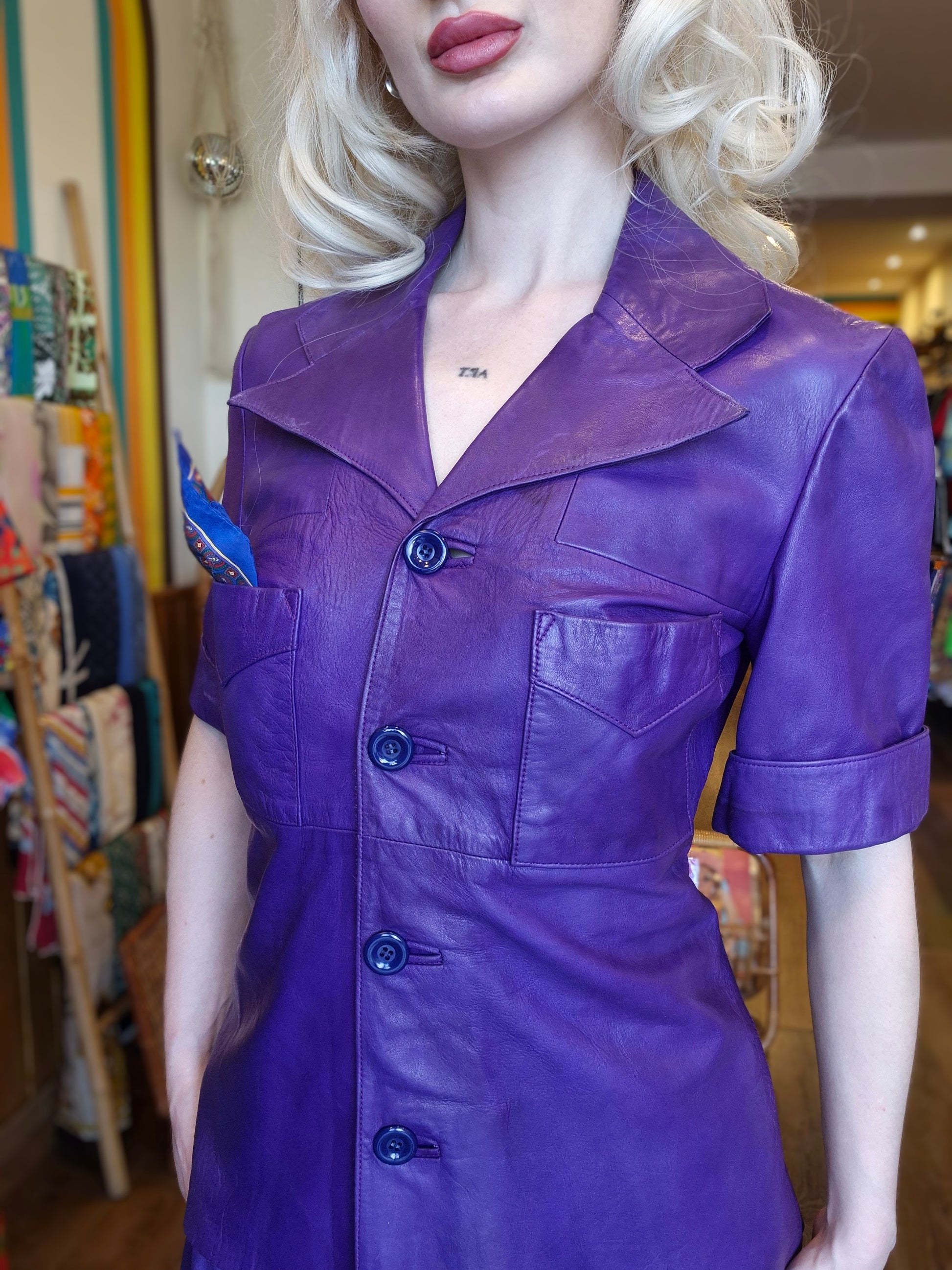 Add a bold pop of vintage style to your wardrobe with this authentic 1970s purple leather two-piece set. Featuring a classic short-sleeve button-up leather jacket and a coordinating knee-length leather skirt, this rare vintage ensemble is perfect for creating a standout retro look. Crafted from soft, genuine leather in a rich purple hue, it’s a true collector’s piece for lovers of 70s fashion, retro outfits, and vintage leather clothing.