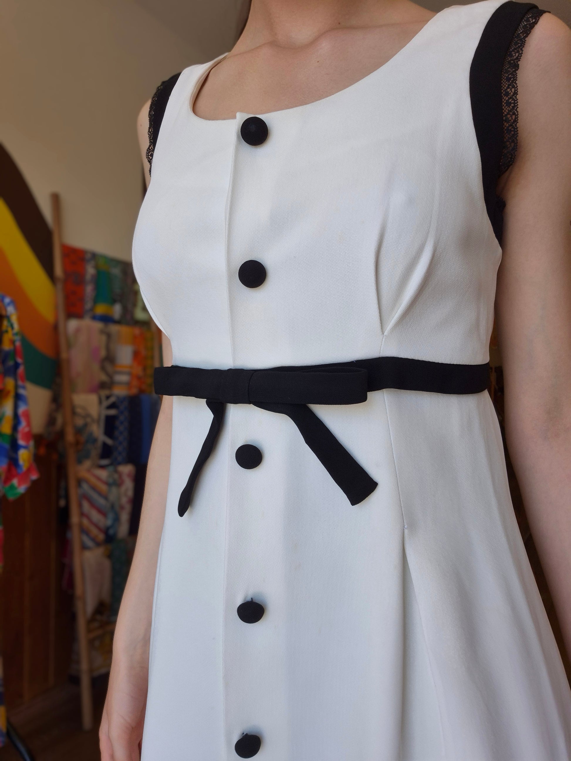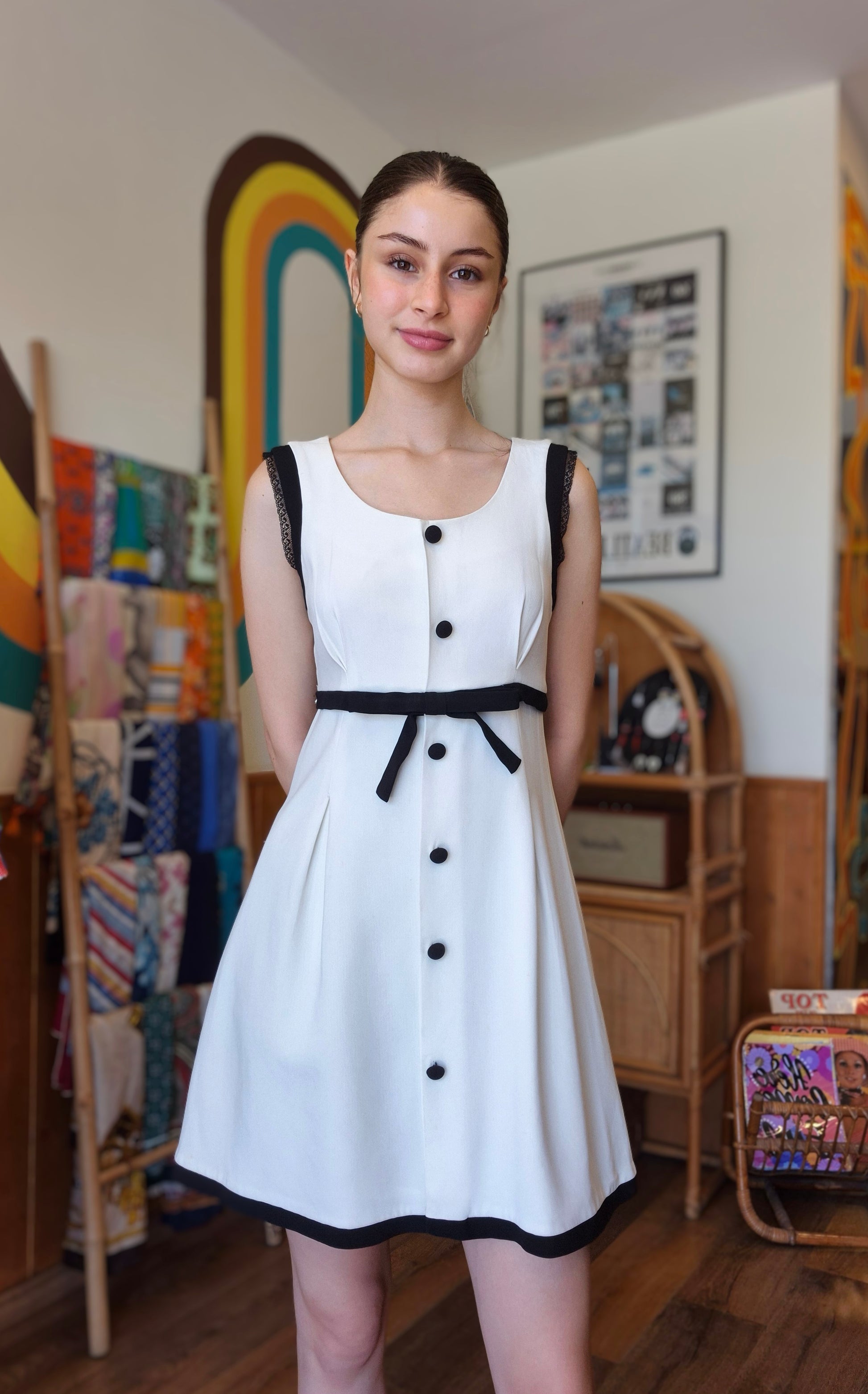 This sleeveless white dress features striking black button details, lace-trimmed shoulders, and a sweet waist tie that flatters every figure. The playful A-line cut and contrasting black hem evoke unmistakable vintage flair, while keeping your look effortlessly polished.