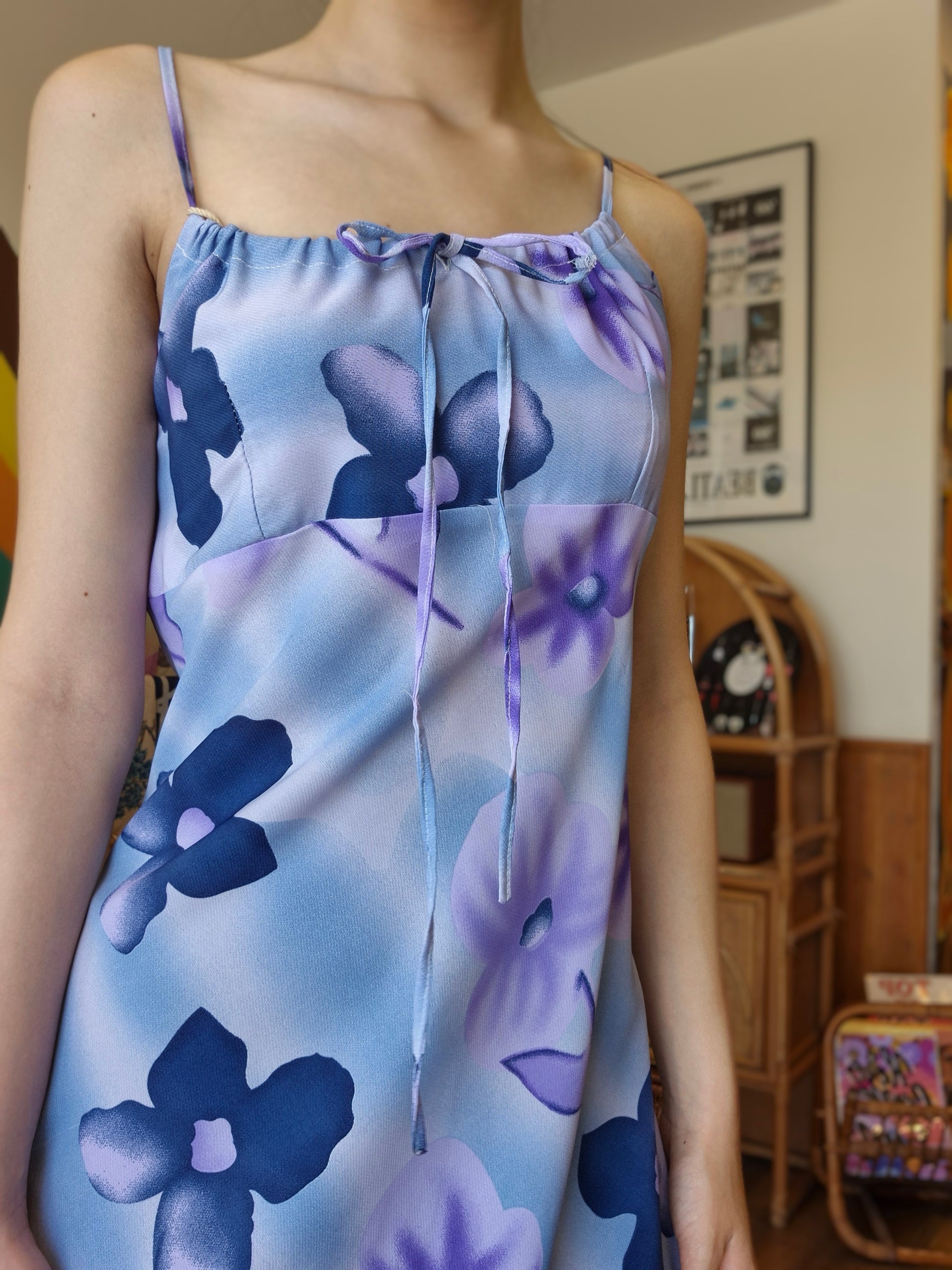 This dreamy piece features a lavender-blue base adorned with oversized airbrushed floral prints in violet and navy. The ruched neckline with tie detail gives it that unmistakable vintage slip-dress feel, perfect for layering or wearing solo on warm, sunny days.