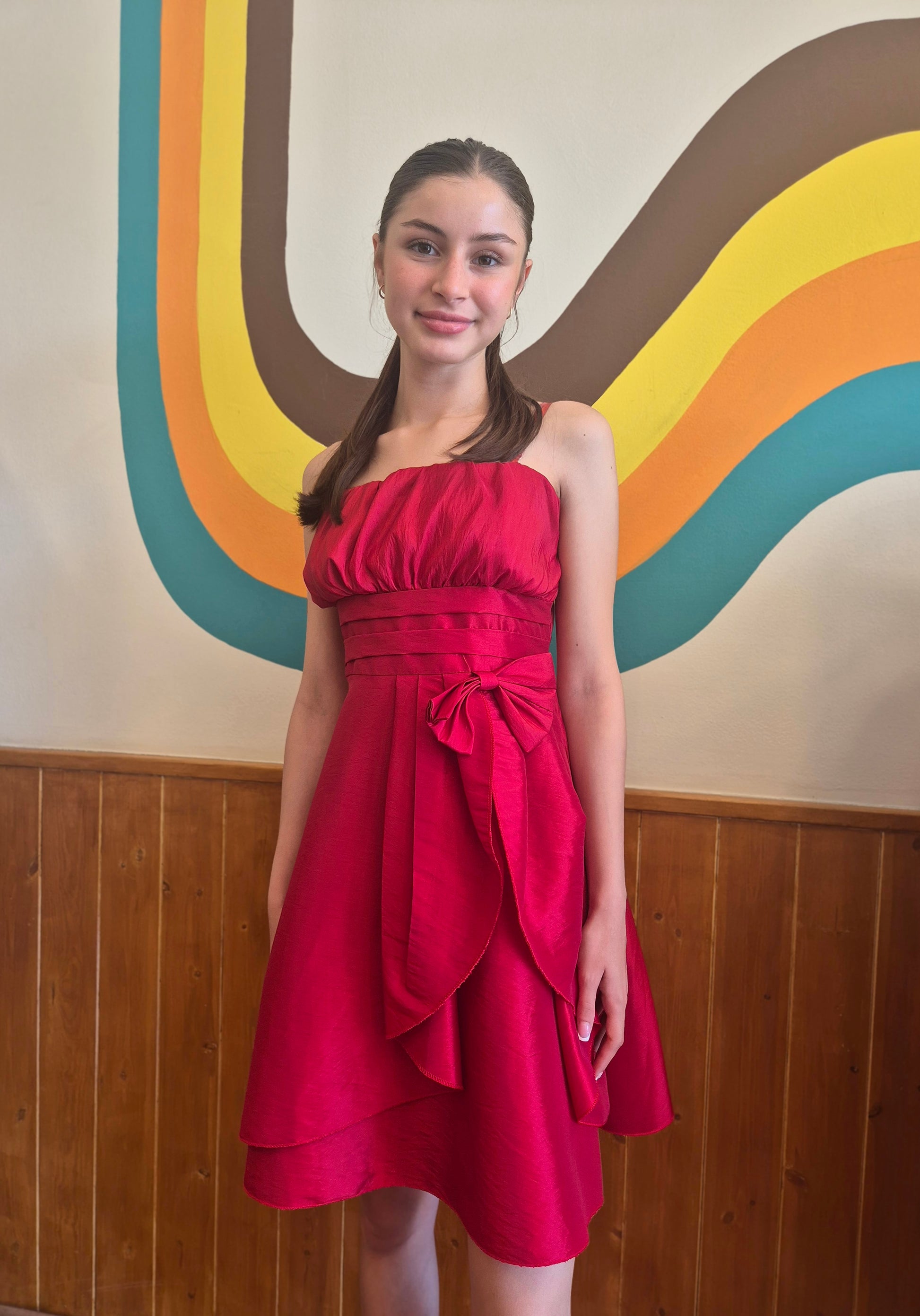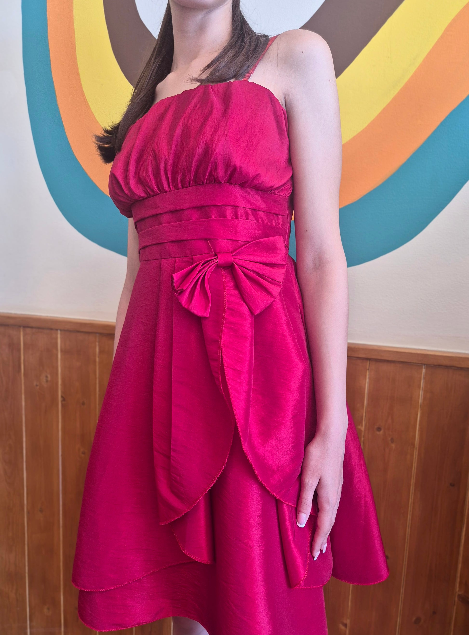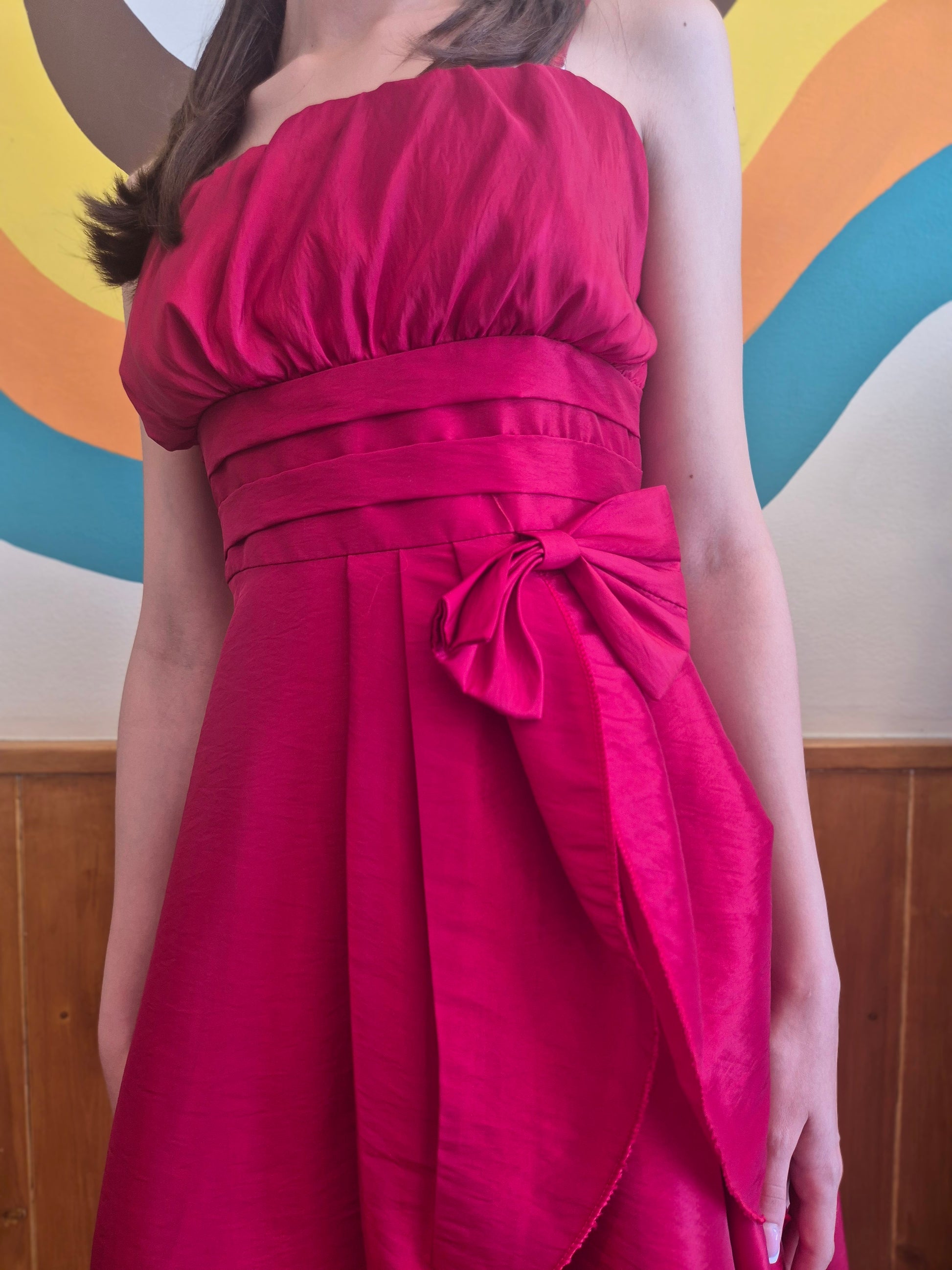 Make a bold entrance with our Cherry Pop Y2K Party Dress, the ultimate throwback for your next night out or special occasion. This vibrant dress piece features a bubble bodice, a pleated waistline, and a dramatic asymmetrical bow detail that screams early-2000s glam. The rich cherry red hue and lustrous texture bring just the right amount of drama, while the layered skirt adds playful volume and movement. Totally flirty, totally fierce.