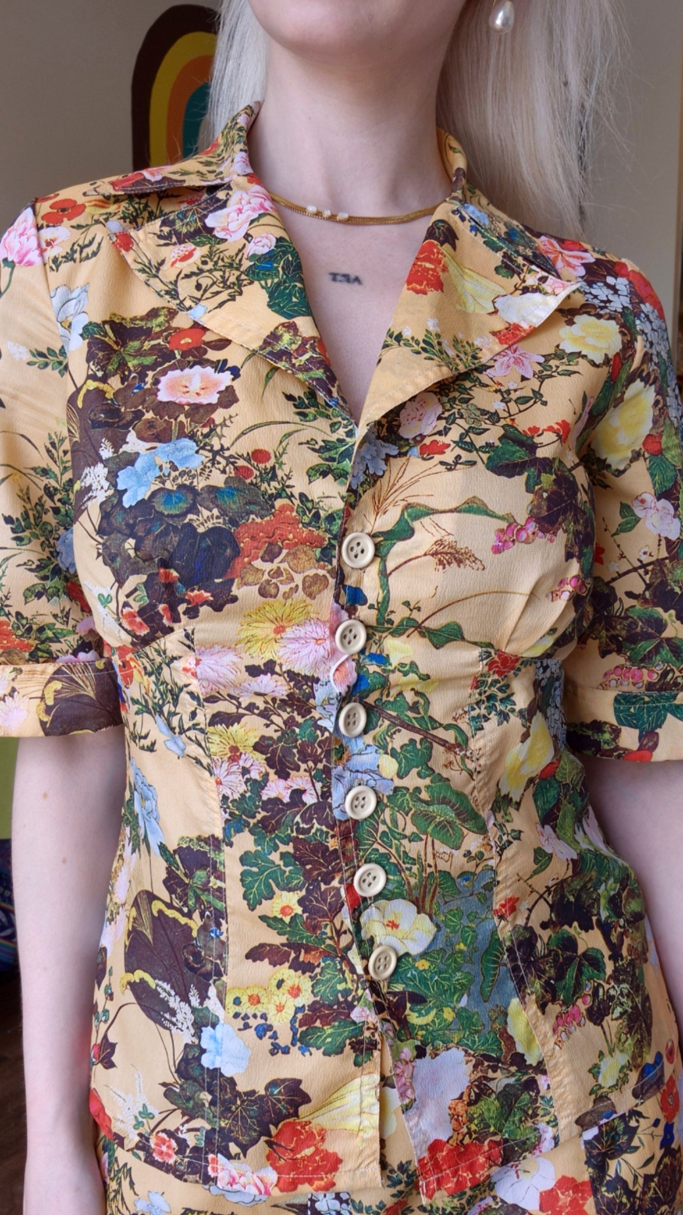 A true '70s gem from Claude Barthelemy Paris, this two-piece glows in floral yellow, breezy and feminine with an unmistakable designer touch.