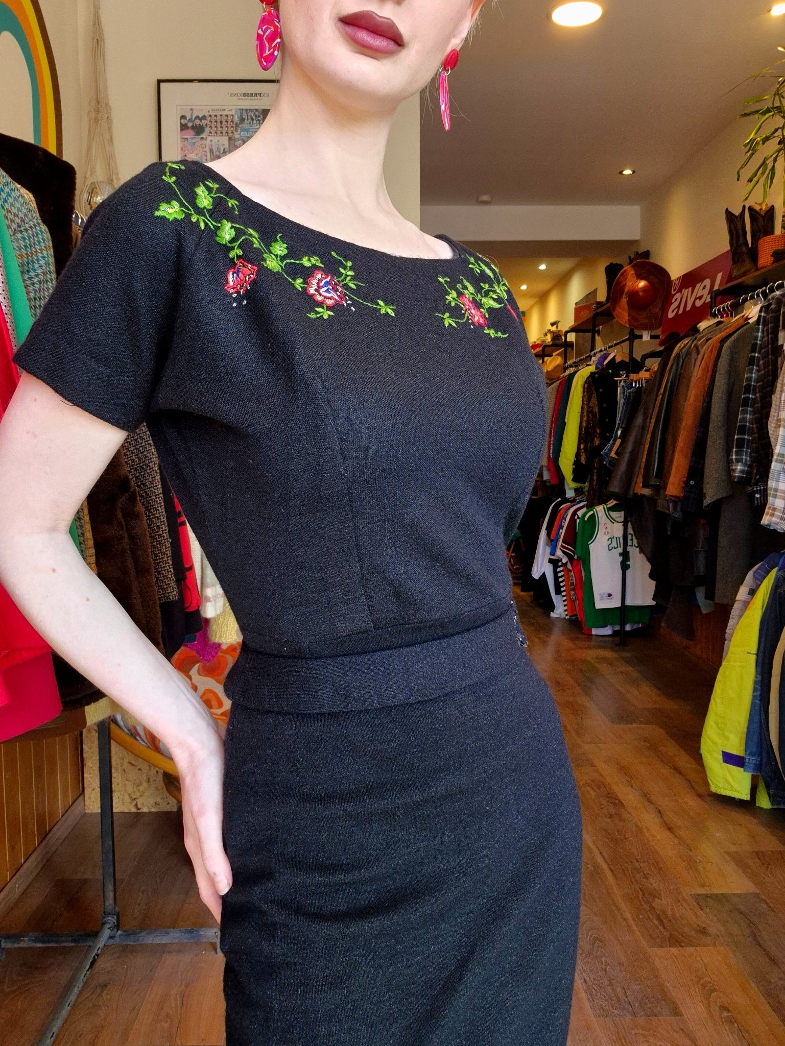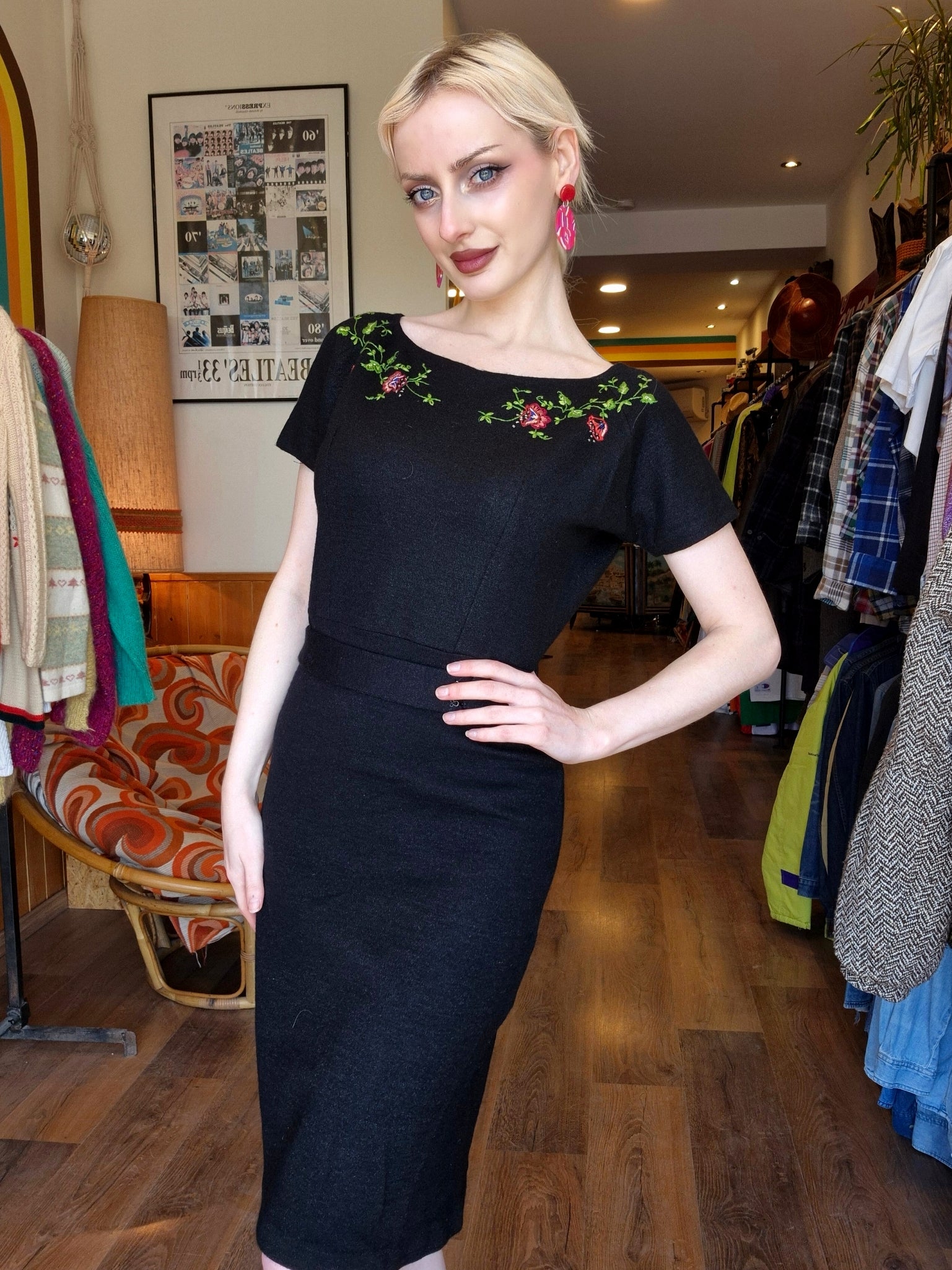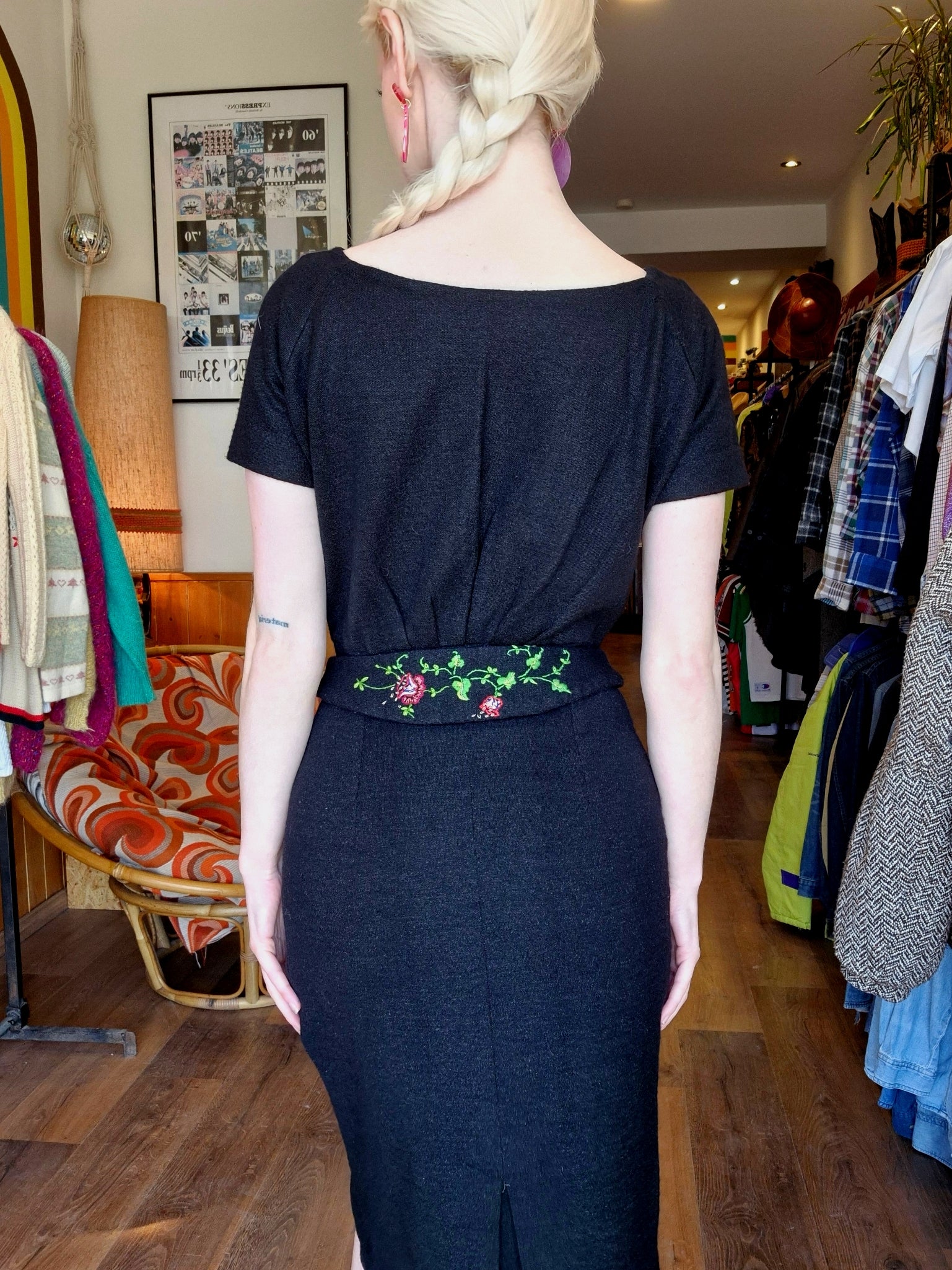 1950s dress designed with a flattering, feminine silhouette that’s perfect for any special occasion. The embroidered floral belt is the highlight of this piece, offering a soft burst of colour and vintage appeal. A truley beautiful peice of history. Please note this dress is 70 years old, whilst it is in a fair condiotion and totally wearable it is not "new" condition.